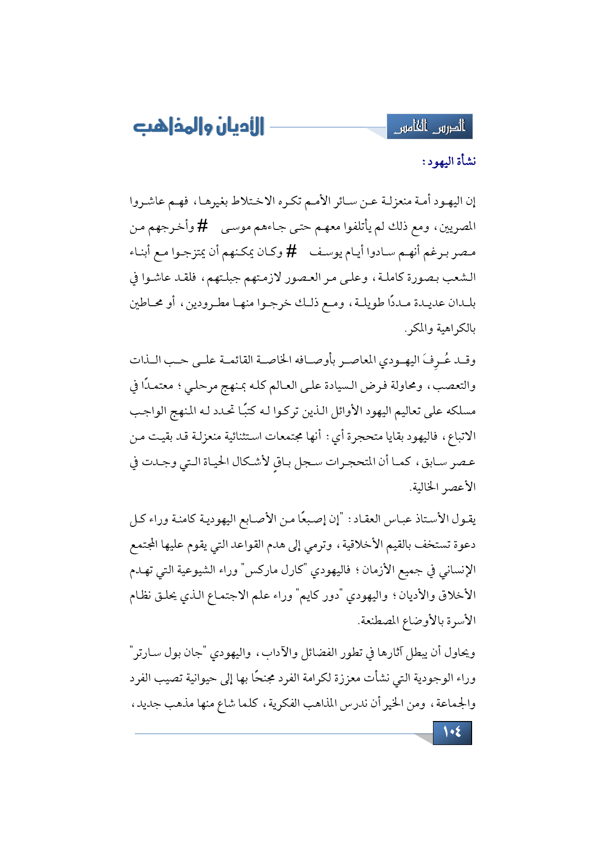 يقول الأستاذ عباس العقاد: "إن إصبعًا من الأصابع اليهودية كامنة وراء كل دعوة تستخف بالقيم الأخلاقية، وترمي إلى هدم القواعد التي يقوم عليها المجتمع الإنساني في جميع الأزمان؛ فاليهودي "كارل ماركس" وراء الشيوعية التي تهدم الأخلاق والأديان؛ واليهودي "دور كايم" وراء علم الاجتماع الذي يحلق نظام الأسرة بالأوضاع المصطنعة، ويحاول أن يبطل آثارها في تطور الفضائل والآداب، واليهودي "جان بول سارتر" وراء الوجودية التي نشأت معززة لكرامة الفرد مجنحًا بها إلى حيوانية تصيب الفرد والجماعة، ومن الخير أن ندرس المذاهب الفكرية، كلما شاع منها مذهب جديد،