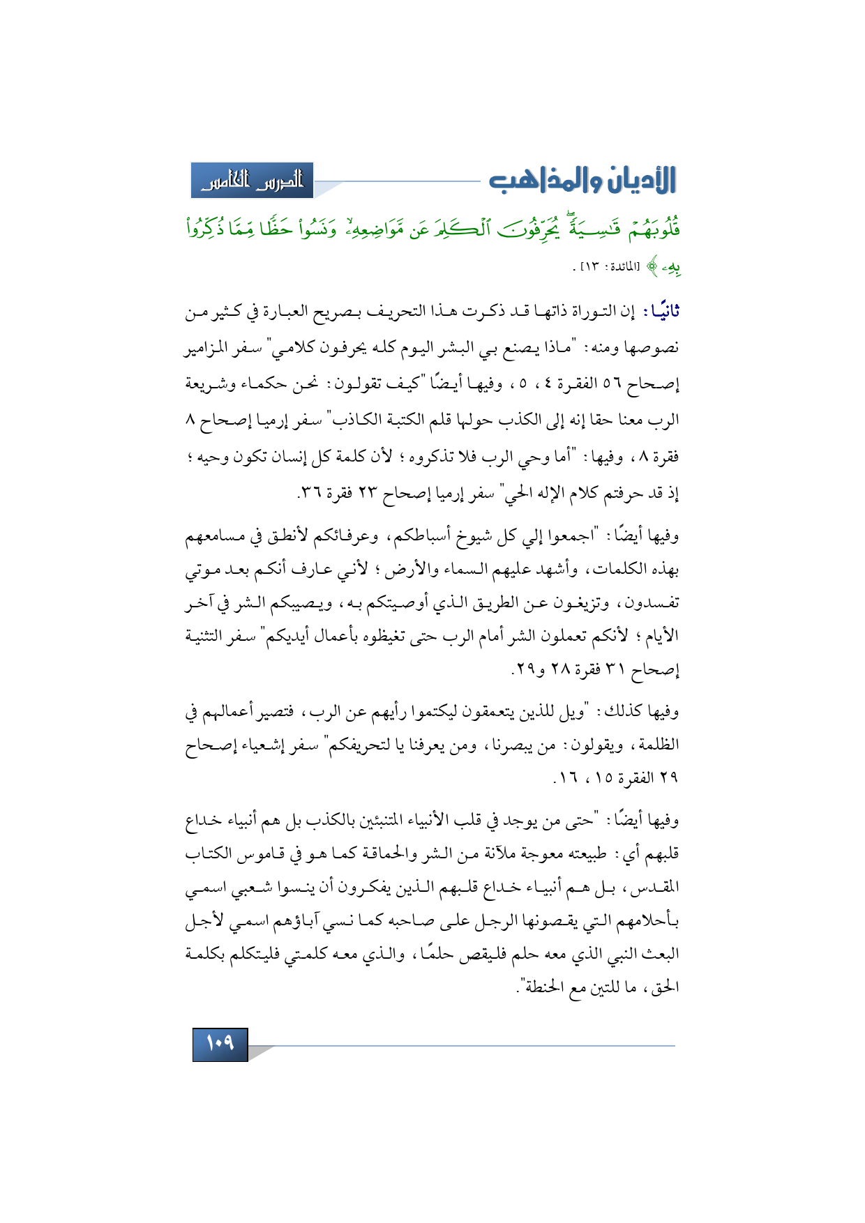 قُلُوبَهُمْ قَاسِيَةً يُحَرِّفُونَ الْكَلِمَ عَنْ مَوَاضِعِهِ وَنَسُوا حَظًّا مِمَّا ذُكِّرُوا بِهِ} (المائدة: 13).