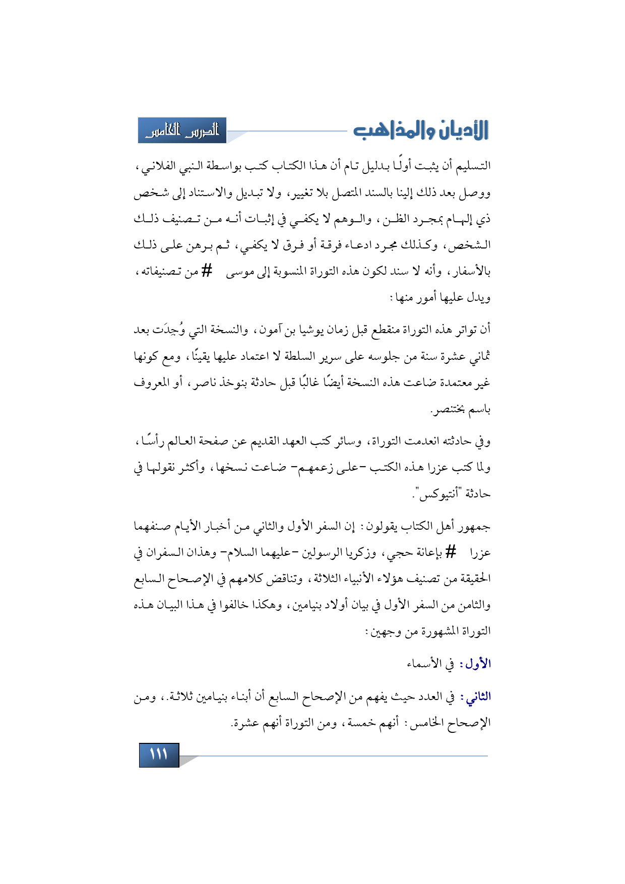 التسليم أن يثبت أولًا بدليل تام أن هذا الكتاب كتب بواسطة النبي الفلاني، ووصل بعد ذلك إلينا بالسند المتصل بلا تغيير، ولا تبديل والاستناد إلى شخص ذي إلهام بمجرد الظن، والوهم لا يكفي في إثبات أنه من تصنيف ذلك الشخص، وكذلك مجرد ادعاء فرقة أو فرق لا يكفي، ثم برهن على ذلك بالأسفار، وأنه لا سند لكون هذه التوراة المنسوبة إلى موسى -عليه السلام- من تصنيفاته، ويدل عليها أمور منها أن تواتر هذه التوراة منقطع قبل زمان يوشيا بن آمون.