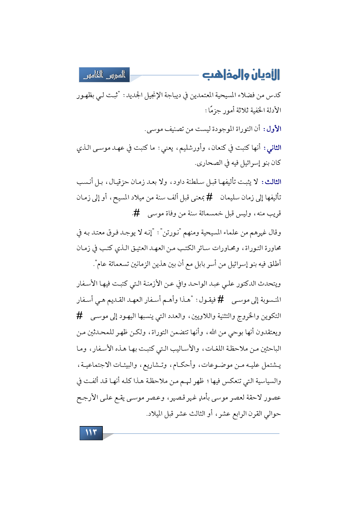 كدس من فضلاء المسيحية المعتمدين في ديباجة الإنجيل الجديد: ثبت لي بظهور الأدلة الخفية ثلاثة أمور جزمًا؛ الأول: أن التوراة الموجودة ليست من تصنيف موسى، والثاني: أنها كتبت في كنعان، وأورشليم، يعني: ما كتبت في عهد موسى الذي كان بنو إسرائيل فيه في الصحارى، والثالث: لا يثبت تأليفها قبل سلطنة داود، ولا بعد زمان حزقيال، بل أنسب تأليفها إلى زمان سليمان -عليه السلام- بمعنى قبل ألف سنة من ميلاد المسيح، أو إلى زمان قريب منه، وليس قبل خمسمائة سنة من وفاة موسى -عليه السلام.