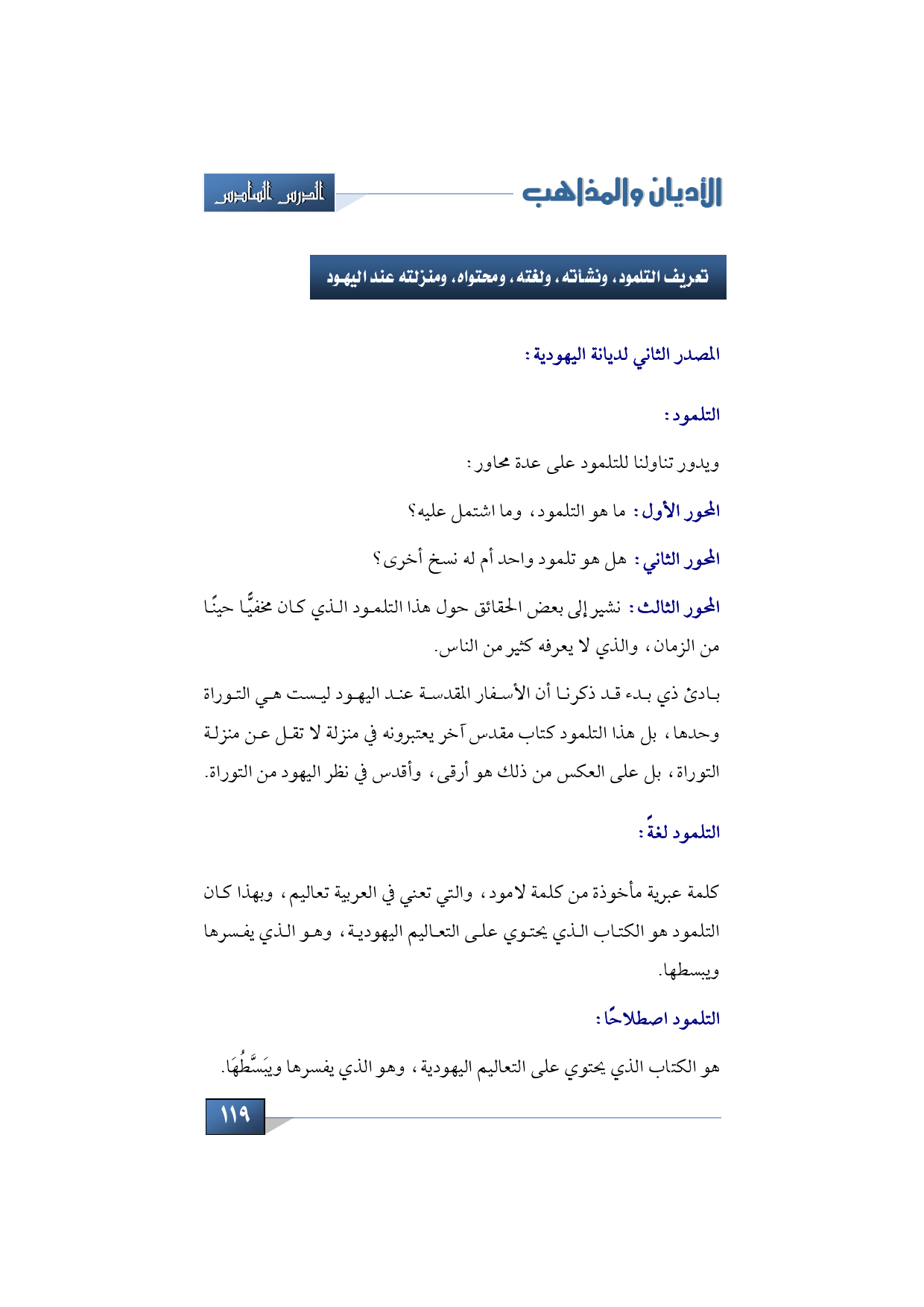 هذا الكتاب هو التلمود، والتلمود اسم مأخوذ من كلمة لامود العبرية، ومعناها تعاليم، وبهذا كان التلمود هو الكتاب الذي يحتوي على التعاليم اليهودية، وهو الذي يفسرها ويبسطها، التلمود لغة؟ كلمة عبرية مأخوذة من كلمة لامود، والتي تعني في العربية تعاليم، واصطلاحًا هو الكتاب الذي يحتوي على التعاليم اليهودية، وهو الذي يفسرها ويبَسَّطُهَا.