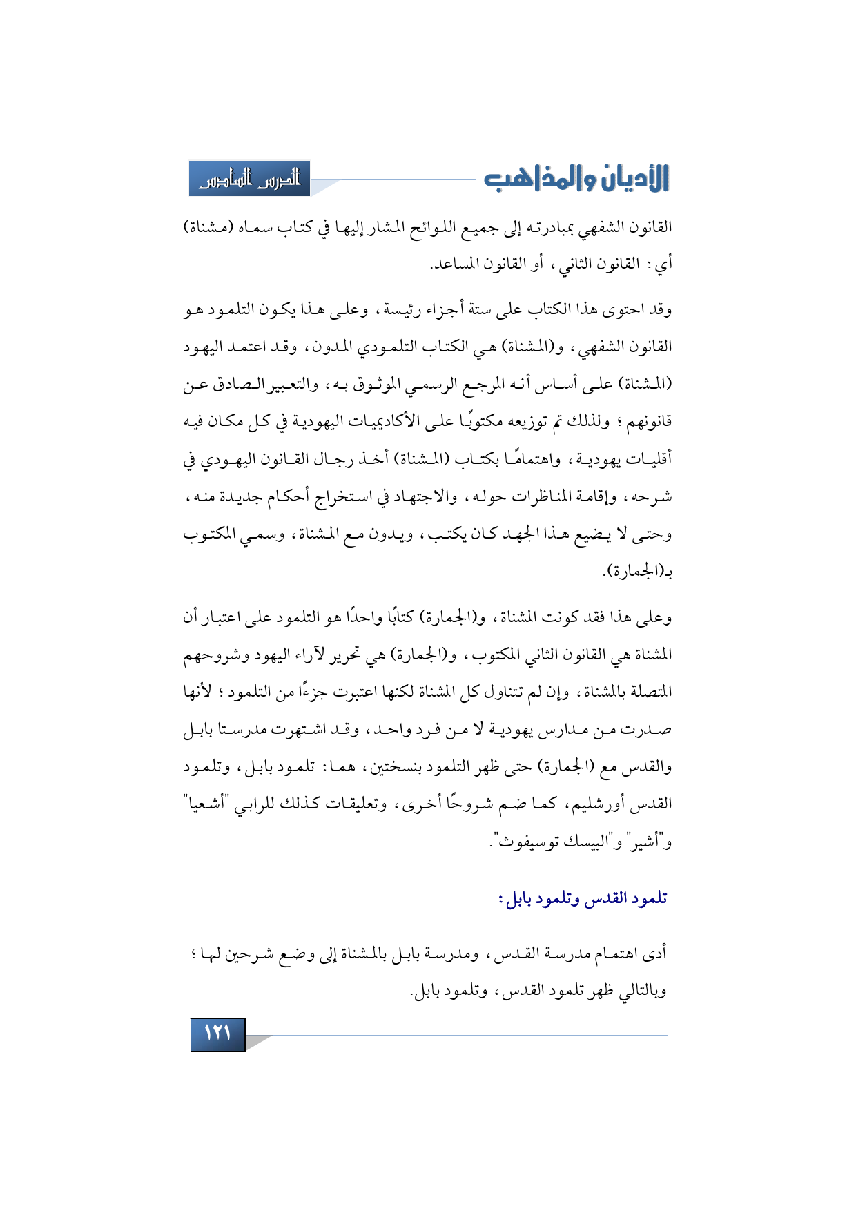 وقد احتوى هذا الكتاب على ستة أجزاء رئيسة، وعلى هذا يكون التلمود هو القانون الشفهي، و (المشناة) هي الكتاب التلمودي المدون، وقد اعتمد اليهود المشناة على أساس أنه المرجع الرسمي الموثوق به، والتعبير الصادق عن قانونهم؛ ولذلك تم توزيعه مكتوبًا على الأكاديميات اليهودية في كل مكان فيه أقليات يهودية، واهتمامًا بكتاب المشناة أخذ رجال القانون اليهودي في شرحه، وإقامة المناظرات حوله، والاجتهاد في استخراج أحكام جديدة منه، وحتى لا يضيع هذا الجهد كان يكتب، ويدون مع المشناة، وسمي المكتوب بالجمارة.