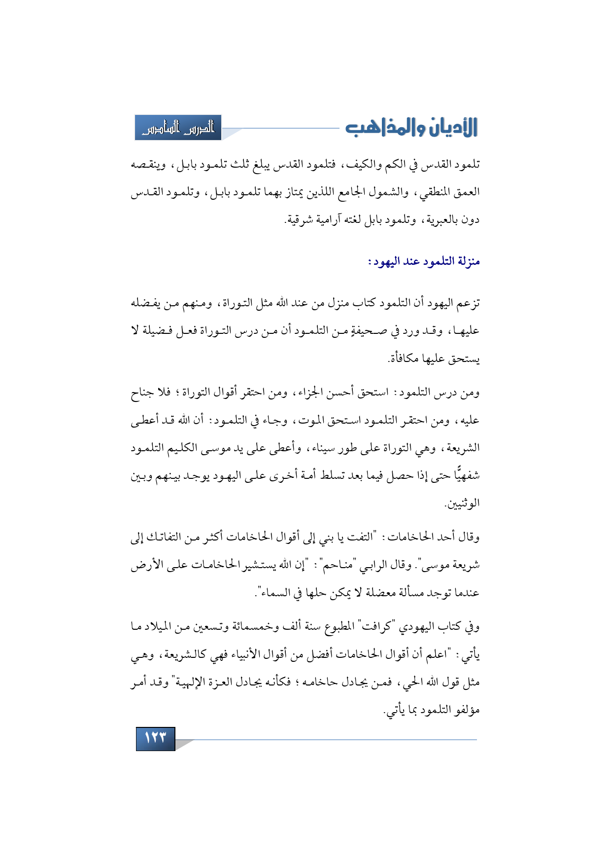 ومن درس التلمود: استحق أحسن الجزاء، ومن احتقر أقوال التوراة؛ فلا جناح عليه، ومن احتقر التلمود استحق الموت، وجاء في التلمود: أن الله قد أعطى الشريعة، وهي التوراة على طور سيناء، وأعطى على يد موسى الكليم التلمود شفهيًّا حتى إذا حصل فيما بعد تسلط أمة أخرى على اليهود يوجد بينهم وبين الوثنيين.