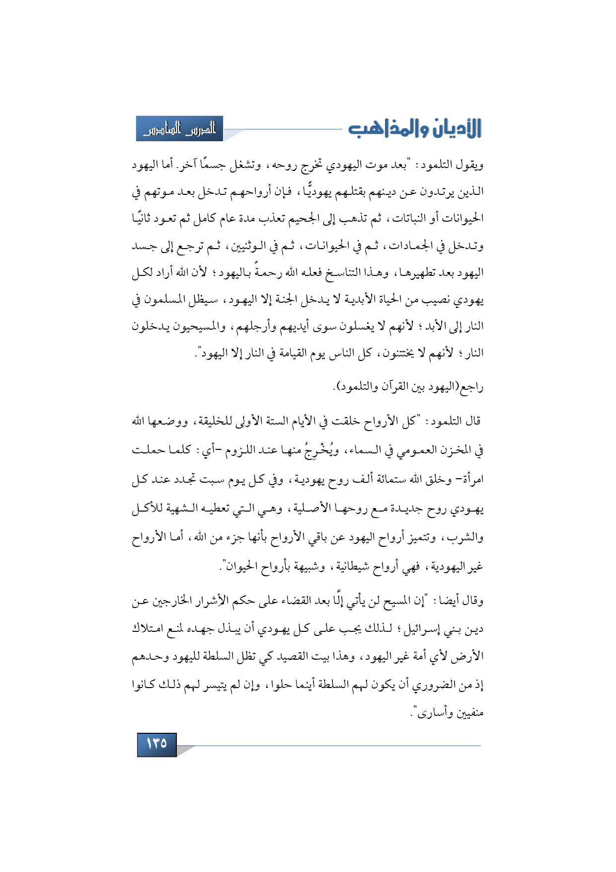 ويقول التلمود: بعد موت اليهودي تخرج روحه، وتشغل جسمًا آخر. أما اليهود الذين يرتدون عن دينهم بقتلهم يهوديًّا، فإن أرواحهم تدخل بعد موتهم في الحيوانات أو النباتات، ثم تذهب إلى الجحيم تعذب مدة عام كامل ثم تعود ثانيًا وتدخل في الجمادات، ثم في الحيوانات، ثم في الوثنيين، ثم ترجع إلى جسد اليهود بعد تطهيرها، وهذا التناسخ فعله الله رحمةً باليهود؛ لأن الله أراد لكل يهودي نصيب من الحياة الأبدية لا يدخل الجنة إلا اليهود، سيظل المسلمون في النار إلى الأبد؛ لأنهم لا يغسلون سوى أيديهم وأرجلهم، والمسيحيون يدخلون النار؛ لأنهم لا يختتنون، كل الناس يوم القيامة في النار إلا اليهود، هذا ما يزعمه اليهود في التلمود، فتعجب لمثل هذا.