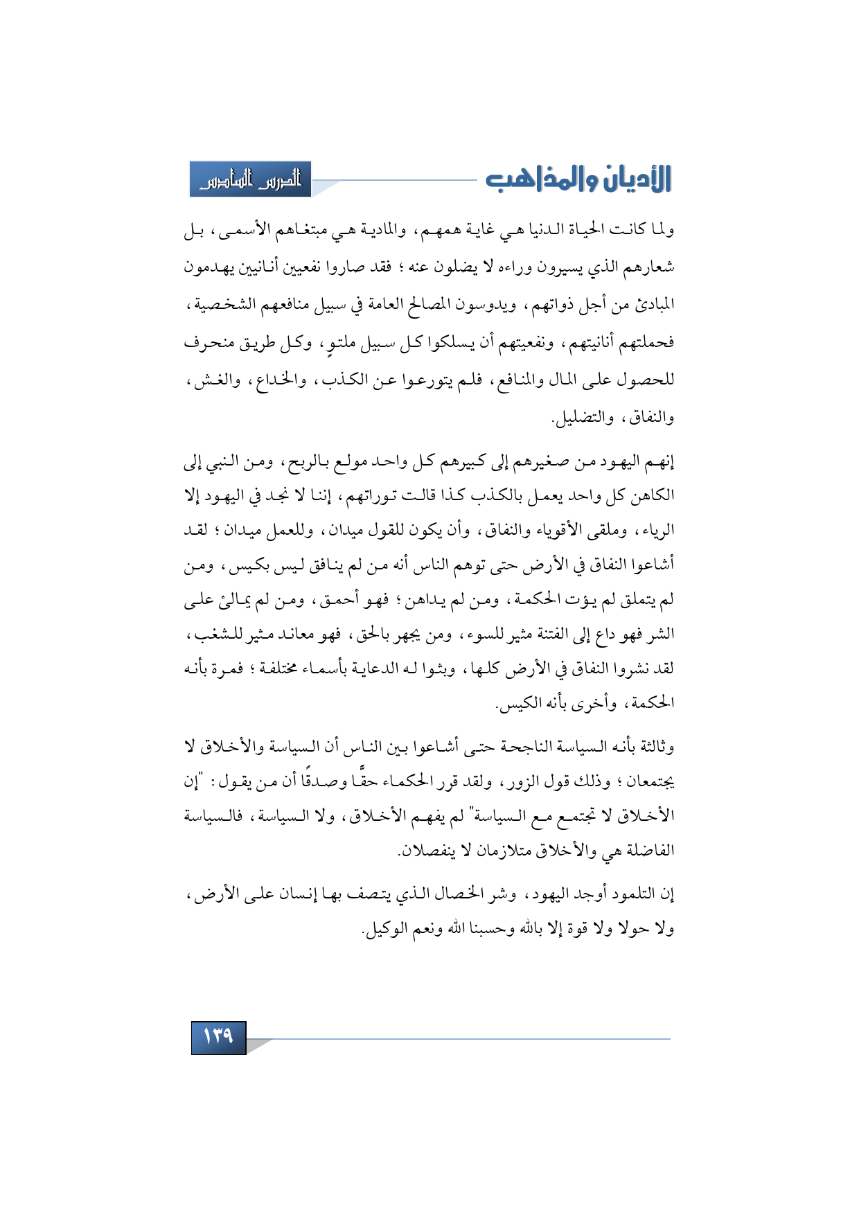 إنهم اليهود من صغيرهم إلى كبيرهم كل واحد مولع بالربح، ومن النبي إلى الكاهن كل واحد يعمل بالكذب كذا قالت توراتهم، إننا لا نجد في اليهود إلا الرياء، وملقى الأقوياء والنفاق، وأن يكون للقول ميدان، وللعمل ميدان؛ لقد أشاعوا النفاق في الأرض حتى توهم الناس أنه من لم ينافق ليس بكيس، ومن لم يتملق لم يؤت الحكمة، ومن لم يداهن؛ فهو أحمق، ومن لم يمالئ على الشر فهو داع إلى الفتنة مثير للسوء، ومن يجهر بالحق، فهو معاند مثير للشغب، لقد نشروا النفاق في الأرض كلها، وبثوا له الدعاية بأسماء مختلفة؛ فمرة بأنه الحكمة، وأخرى بأنه الكيس، وثالثة بأنه السياسة الناجحة حتى أشاعوا بين الناس أن السياسة والأخلاق لا يجتمعان؛ وذلك قول الزور، ولقد قرر الحكماء حقًّا وصدقًا أن من يقول: إن الأخلاق لا تجتمع مع السياسة لم يفهم الأخلاق، ولا السياسة، فالسياسة الفاضلة هي والأخلاق متلازمان لا ينفصلان.