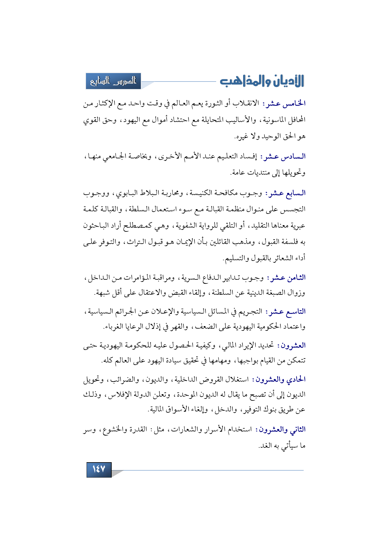 الخامس عشر: الانقلاب أو الثورة يعم العالم في وقت واحد مع الإكثار من المحافل الماسونية، والأساليب المتحايلة مع احتشاد أموال مع اليهود، وحق القوي هو الحق الوحيد ولا غيره.