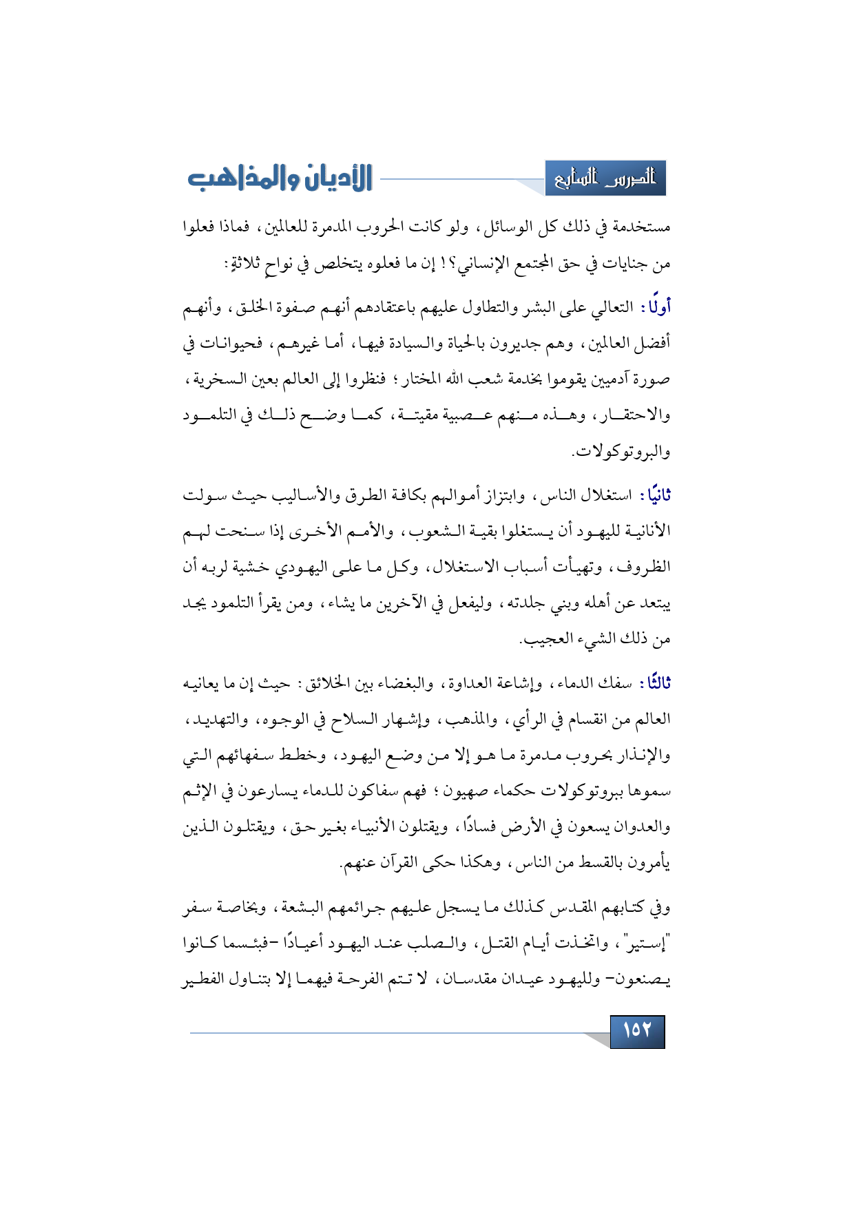 ثالثًا: سفك الدماء، وإشاعة العداوة، والبغضاء بين الخلائق: حيث إن ما يعانيه العالم من انقسام في الرأي، والمذهب، وإشهار السلاح في الوجوه، والتهديد، والإنذار بحروب مدمرة ما هو إلا من وضع اليهود، وخطط سفهائهم التي سموها ببروتوكولات حكماء صهيون؛ فهم سفاكون للدماء يسارعون في الإثم والعدوان يسعون في الأرض فسادًا، ويقتلون الأنبياء بغير حق، ويقتلون الذين يأمرون بالقسط من الناس، وهكذا حكى القرآن عنهم.