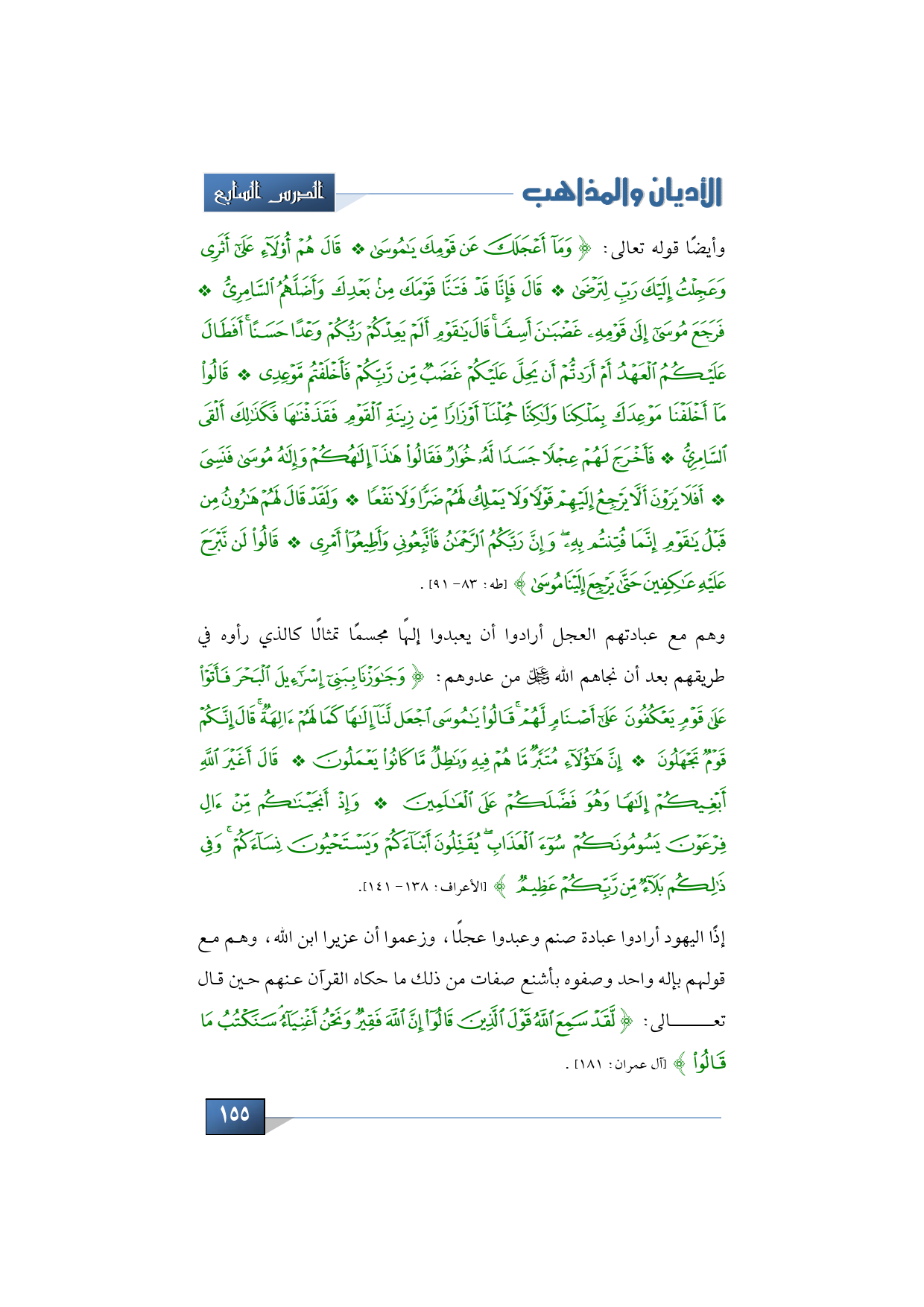 وأيضًا قوله تعالى: {وَمَا أَعْجَلَكَ عَنْ قَوْمِكَ يَا مُوسَى قَالَ هُمْ أُولَاءِ عَلَى أَثَرِي * وَعَجِلْتُ إِلَيْكَ رَبِّ لِتَرْضَى* قَالَ فَإِنَّا قَدْ فَتَنَّا قَوْمَكَ مِنْ بَعْدِكَ وَأَضَلَّهُمُ السَّامِرِيُّ * فَرَجَعَ مُوسَى إِلَى قَوْمِهِ غَضْبَانَ أَسِفًا * قَالَ يَا قَوْم أَلَمْ يَعِدْكُمْ رَبُّكُمْ وَعْدًا حَسَنًا أَفَطَالَ عَلَيْكُمُ الْعَهْدُ أَمْ أَرَدْتُمْ أَنْ يَحِلَّ عَلَيْكُمْ غَضَبٌ مِنْ رَبِّكُمْ فَأَخْلَفْتُمْ مَوْعِدِي * قَالُوا مَا أَخْلَفْنَا مَوْعِدَكَ بِمَلْكِنَا وَلَكِنَّا حُمِّلْنَا أَوْزَارًا مِنْ زِينَةِ الْقَوْمِ فَقَذَفْنَاهَا فَكَذَلِكَ أَلْقَى السَّامِرِيُّ * فَأَخْرَجَ لَهُمْ عِجْلًا جَسَدًا لَهُ خُوَارٌ فَقَالُوا هَذَا إِلَهُكُمْ وَإِلَهُ مُوسَى فَنَسِيَ * أَفَلَا يَرَوْنَ أَلَّا يَرْجِعُ إِلَيْهِمْ قَوْلًا وَلَا يَمْلِكُ لَهُمْ ضَرًّا وَلَا نَفْعًا * وَلَقَدْ قَالَ لَهُمْ هَارُونُ مِنْ قَبْلُ يَا قَوْم إِنَّمَا فُتِنْتُمْ بِهِ وَإِنَّ رَبَّكُمُ الرَّحْمَنُ فَاتَّبِعُونِي وَأَطِيعُوا أَمْرِي * قَالُوا لَنْ نَبْرَحَ عَلَيْهِ عَاكِفِينَ حَتَّى يَرْجِعَ إِلَيْنَا مُوسَى} (طه: 83 - 91).