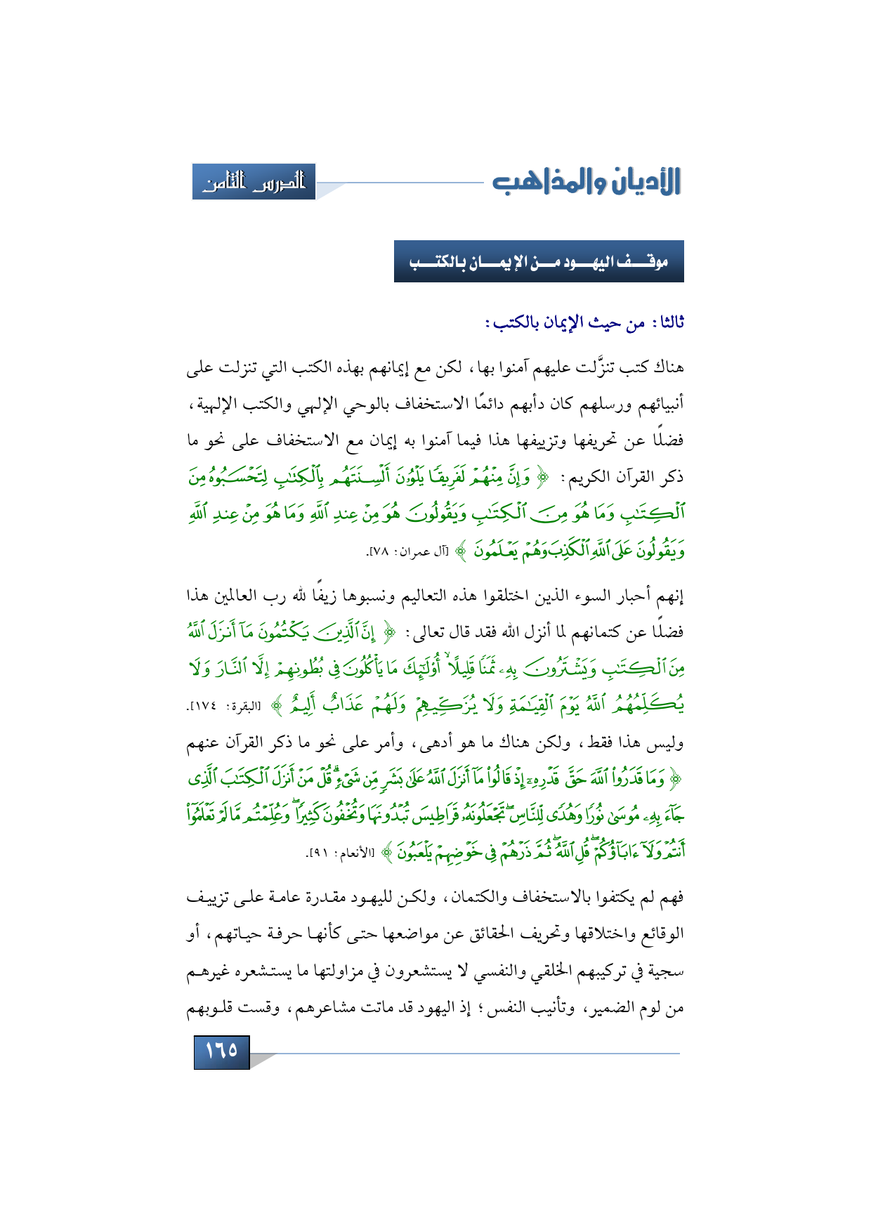 فإذا انتقلنا من الكلام عن إيمانهم بالله وملائكته إلى الإيمان بالكتب، فكيف إيمان اليهود بالكتب هناك كتب تنزلت عليهم آمنوا بها، لكن مع إيمانهم بهذه الكتب التي تنزلت على أنبيائهم ورسلهم كان دأبهم دائمًا الاستخفاف بها الاستخفاف بالوحي الإلهي والكتب الإلهية، فضلًا عن تحريفها وتزييفها هذا فيما آمنوا به إيمان مع الاستخفاف بالوحي الإلهي والكتب الإلهية على نحو ما ذكر القرآن الكريم: {وَإِنَّ مِنْهُمْ لَفَرِيقًا يَلْوُونَ أَلْسِنَتَهُمْ بِالْكِتَابِ لِتَحْسَبُوهُ مِنَ الْكِتَابِ وَمَا هُوَ مِنَ الْكِتَابِ وَيَقُولُونَ هُوَ مِنْ عِنْدِ اللَّهِ وَمَا هُوَ مِنْ عِنْدِ اللَّهِ وَيَقُولُونَ عَلَى اللَّهِ الْكَذِبَ وَهُمْ يَعْلَمُونَ} (آل عمران: 78).