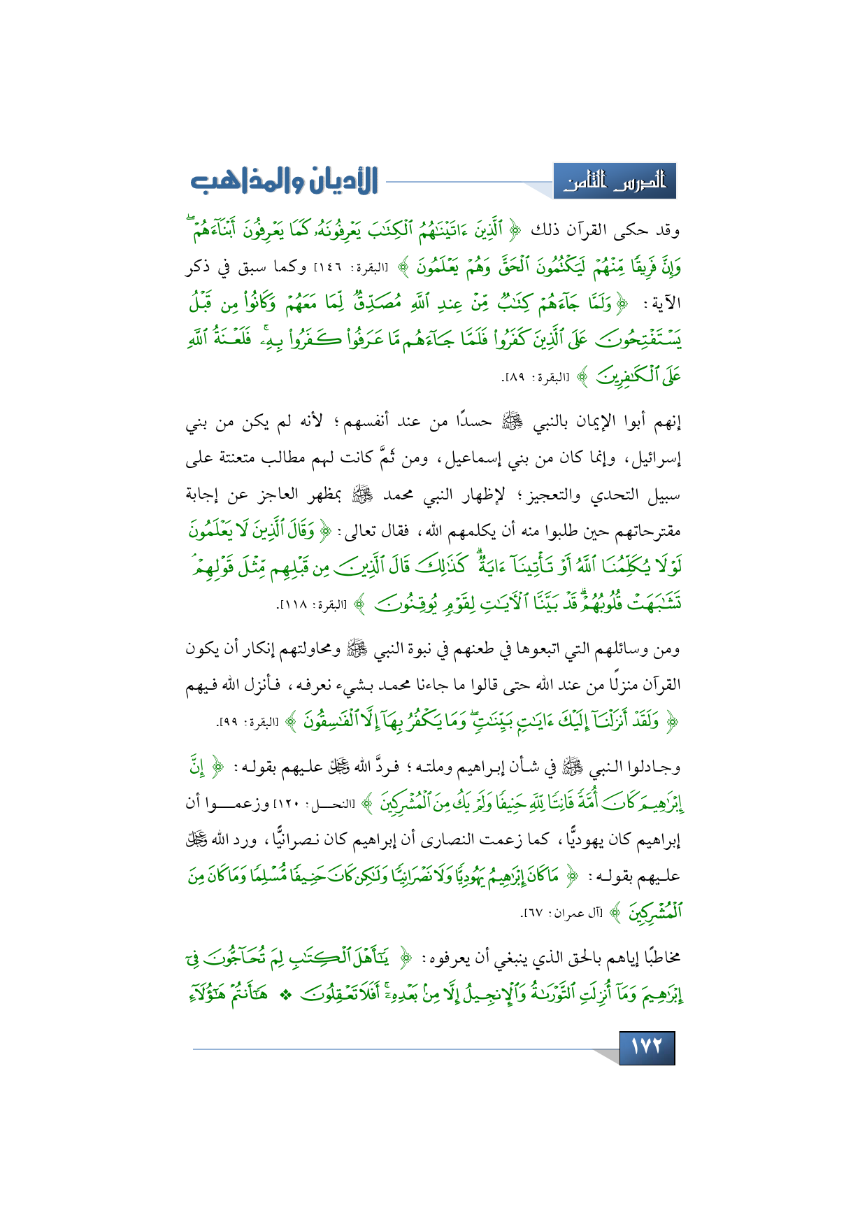 وجادلوا النبي -عليه الصلاة والسلام- في شأن إبراهيم وملته؛ فردَّ الله -عز وجل- عليهم بقوله: {إِنَّ إِبْرَاهِيمَ كَانَ أُمَّةً قَانِتًا لِلَّهِ حَنِيفًا وَلَمْ يَكُ مِنَ الْمُشْرِكِينَ} (النحل: 120) وزعموا أن إبراهيم كان يهوديًّا، كما زعمت النصارى أن إبراهيم كان نصرانيًّا، ورد الله -عز وجل- عليهم بقوله: {مَا كَانَ إِبْرَاهِيمُ يَهُودِيًّا وَلَا نصرانيًّا وَلَكِنْ كَانَ حَنِيفًا مُسْلِمًا وَمَا كَانَ مِنَ الْمُشْرِكِينَ} (آل عمران: 67) مخاطبًا إياهم بالحق الذي ينبغي أن يعرفوه: {يَا أَهْل الْكِتَابِ لِمَ تُحَاجُّونَ فِي إِبْرَاهِيمَ وَمَا أُنْزِلَتِ التَّوْرَاةُ وَالْإِنْجِيلُ إِلَّا مِنْ بَعْدِهِ أَفَلَا تَعْقِلُونَ * هَا أَنْتُمْ هَؤُلَاءِ