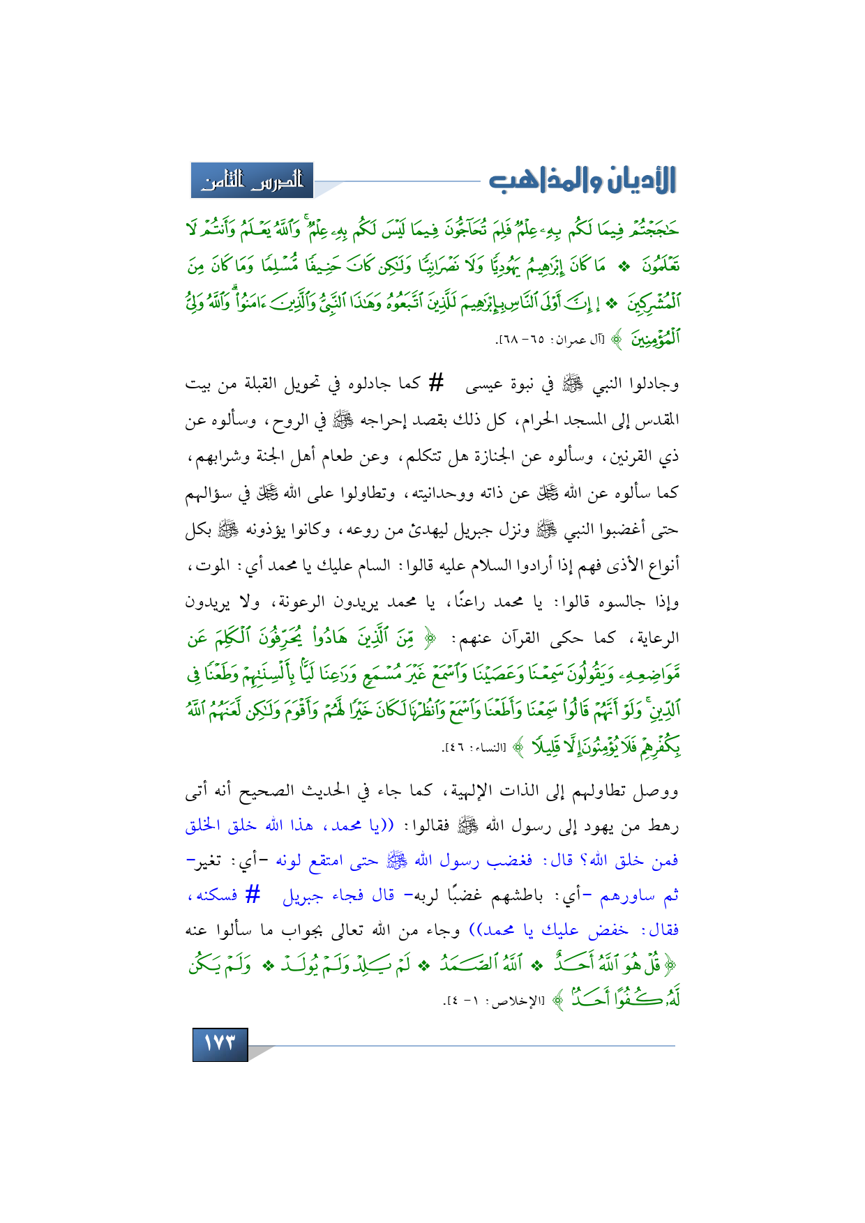 حَاجَجْتُمْ فِيمَا لَكُمْ بِهِ عِلْمٌ فَلِمَ تُحَاجُّونَ فِيمَا لَيْسَ لَكُمْ بِهِ عِلْمٌ وَاللَّهُ يَعْلَمُ وَأَنْتُمْ لَا تَعْلَمُونَ * مَا كَانَ إِبْرَاهِيمُ يَهُودِيًّا وَلَا نصرانيًّا وَلَكِنْ كَانَ حَنِيفًا مُسْلِمًا وَمَا كَانَ مِنَ الْمُشْرِكِينَ * إِنَّ أَوْلَى النَّاسِ بِإِبْرَاهِيمَ لَلَّذِينَ اتَّبَعُوهُ وَهَذَا النَّبِيُّ وَالَّذِينَ آمَنُوا وَاللَّهُ وَلِيُّ الْمُؤْمِنِينَ} (آل عمران: 65 - 68).