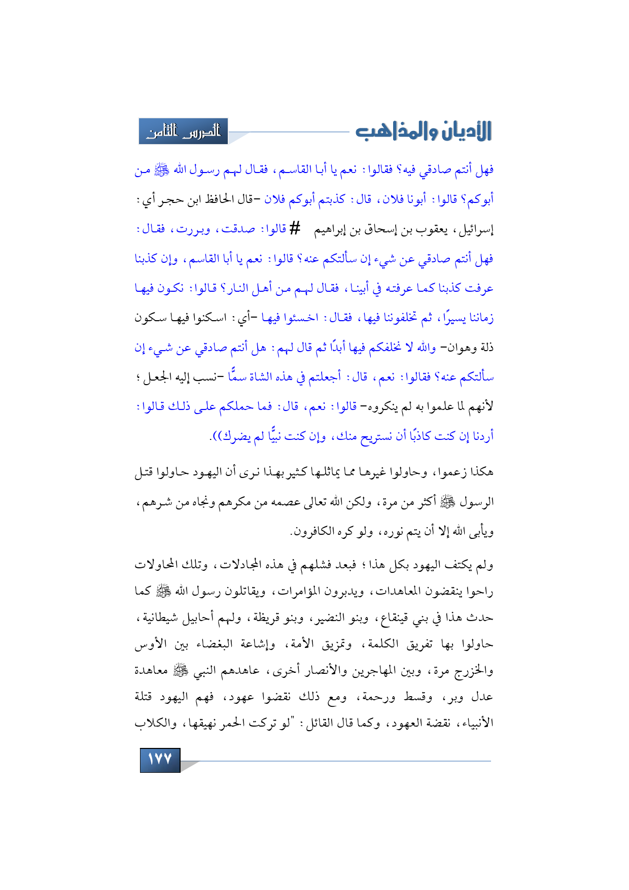 فهل أنتم صادقي فيه؟ فقالوا: نعم يا أبا القاسم، فقال لهم رسول الله -صلى الله عليه وسلم- من أبوكم؟ قالوا: أبونا فلان، قال: كذبتم أبوكم فلان -قال الحافظ ابن حجر أي: إسرائيل، يعقوب بن إسحاق بن إبراهيم -عليه السلام- قالوا: صدقت، وبررت، فقال: فهل أنتم صادقي عن شيء إن سألتكم عنه؟ قالوا: نعم يا أبا القاسم، وإن كذبنا عرفت كذبنا كما عرفته في أبينا، فقال لهم من أهل النار؟ قالوا: نكون فيها زماننا يسيرًا، ثم تخلفوننا فيها، فقال: اخسئوا فيها أي: اسكنوا فيها سكون ذلة وهوان- والله لا نخلفكم فيها أبدًا ثم قال لهم: هل أنتم صادقي عن شيء إن سألتكم عنه؟ فقالوا: نعم، قال: أجعلتم في هذه الشاة سمًّا -نسب إليه الجعل؛ لأنهم لما علموا به لم ينكروه- قالوا: نعم، قال: فما حملكم على ذلك قالوا: أردنا إن كنت كاذبًا أن نستريح منك، وإن كنت نبيًّا لم يضرك)). هكذا زعموا، وحاولوا غيرها مما يماثلها كثير بهذا نرى أن اليهود حاولوا قتل الرسول -صلى الله عليه وسلم- أكثر من مرة، ولكن الله تعالى عصمه من مكرهم ونجاه من شرهم، ويأبى الله إلا أن يتم نوره، ولو كره الكافرون.