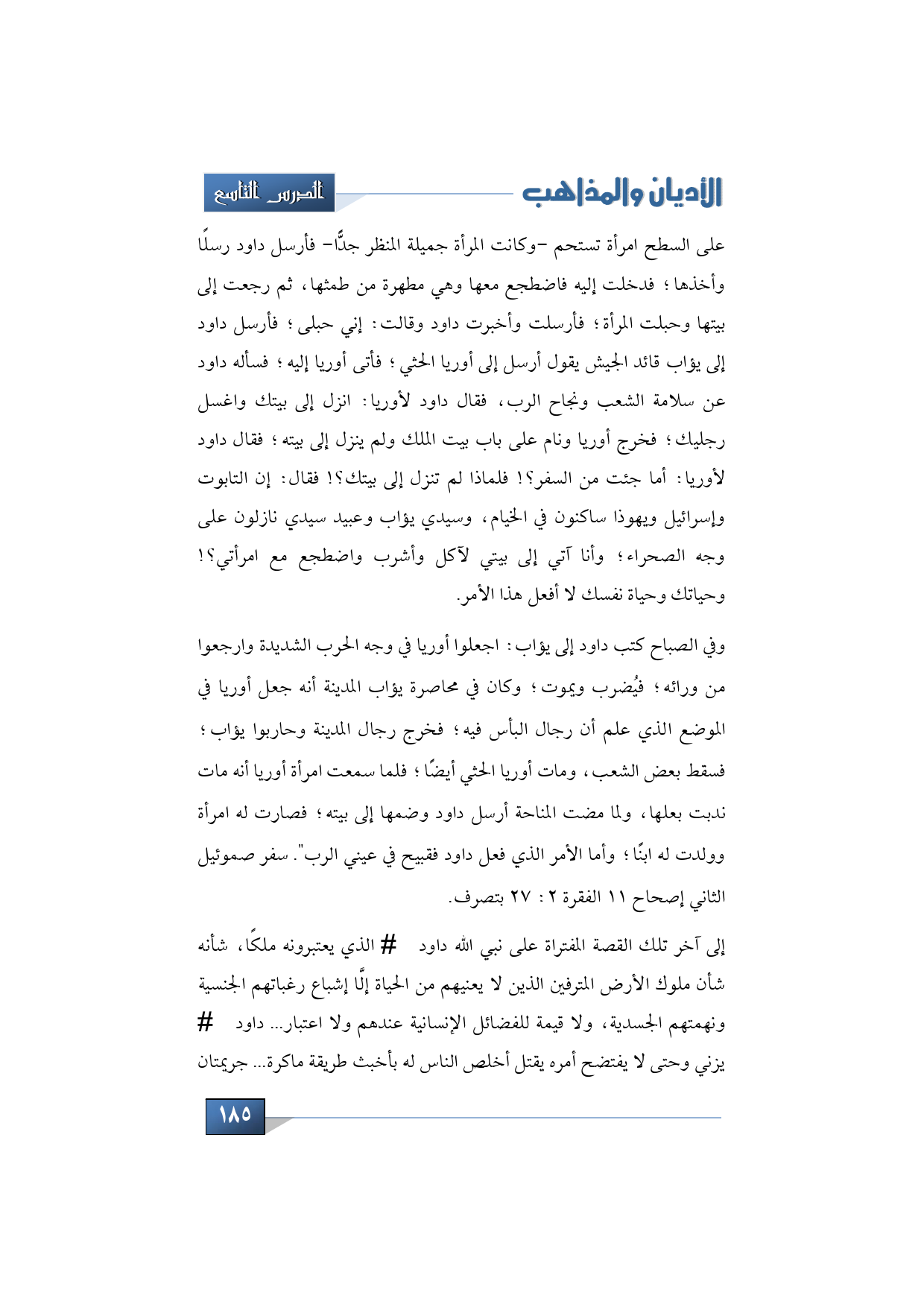 على السطح امرأة تستحم -وكانت المرأة جميلة المنظر جدًّا- فأرسل داود رسلًا وأخذها؛ فدخلت إليه فاضطجع معها وهي مطهرة من طمثها، ثم رجعت إلى بيتها وحبلت المرأة؛ فأرسلت وأخبرت داود وقالت: إني حبلى؛ فأرسل داود إلى يؤاب قائد الجيش يقول أرسل إلى أوريا الحثي؛ فأتى أوريا إليه؛ فسأله داود عن سلامة الشعب ونجاح الرب، فقال داود لأوريا: انزل إلى بيتك واغسل رجليك؛ فخرج أوريا ونام على باب بيت الملك ولم ينزل إلى بيته؛ فقال داود لأوريا: أما جئت من السفر؟! فلماذا لم تنزل إلى بيتك؟! فقال: إن التابوت وإسرائيل ويهوذا ساكنون في الخيام، وسيدي يؤاب وعبيد سيدي نازلون على وجه الصحراء؛ وأنا آتي إلى بيتي لآكل وأشرب واضطجع مع امرأتي؟! وحياتك وحياة نفسك لا أفعل هذا الأمر.