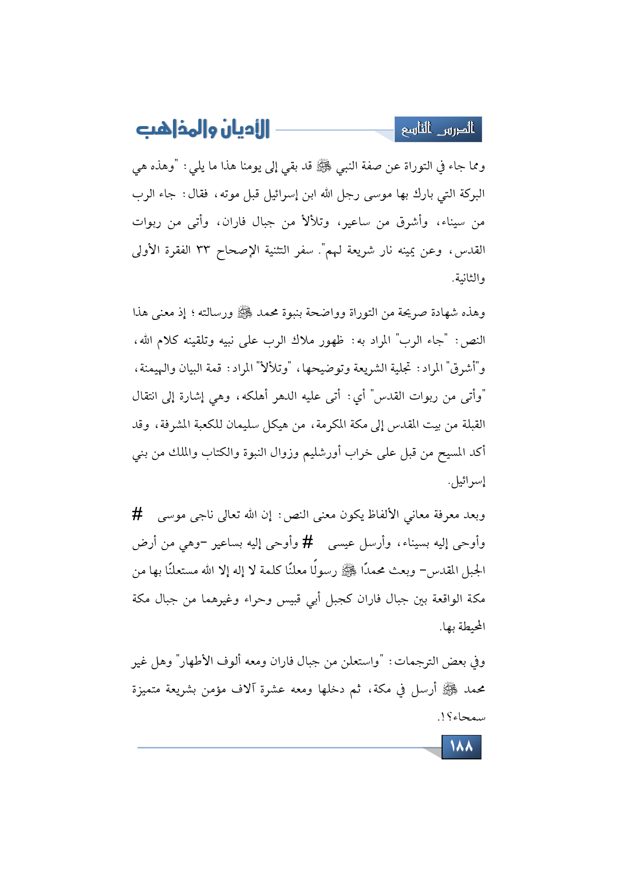 ومما جاء في التوراة عن صفة النبي -عليه الصلاة والسلام- قد بقي إلى يومنا هذا ما يلي: "وهذه هي البركة التي بارك بها موسى رجل الله ابن إسرائيل قبل موته، فقال: جاء الرب من سيناء، وأشرق من ساعير، وتلألأ من جبال فاران، وأتى من ربوات القدس، وعن يمينه نار شريعة لهم". سفر التثنية الإصحاح 33 الفقرة الأولى والثانية.