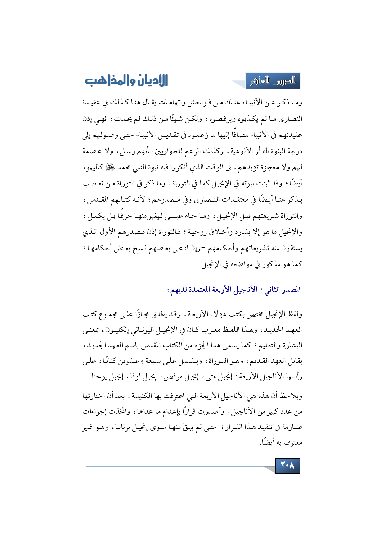 وما ذكر عن الأنبياء هناك من فواحش واتهامات يقال هنا كذلك في عقيدة النصارى ما لم يكذبوه ويرفضوه؛ ولكن شيئًا من ذلك لم يحدث؛ فهي إذن عقيدتهم في الأنبياء مضافًا إليها ما زعموه في تقديس الأنبياء حتى وصولهم إلى درجة البنوة لله أو الألوهية، وكذلك الزعم للحواريين بأنهم رسل، ولا عصمة لهم ولا معجزة تؤيدهم، في الوقت الذي أنكروا فيه نبوة النبي محمد -صلى الله عليه وآله وسلم- كاليهود أيضًا؛ وقد ثبتت نبوته في الإنجيل كما في التوراة، وما ذكر في التوراة من تعصب يذكر هنا أيضًا في معتقدات النصارى وفي مصدرهم؛ لأنه كتابهم المقدس، والتوراة شريعتهم قبل الإنجيل، وما جاء عيسى ليغير منها حرفًا بل يكمل؛ والإنجيل ما هو إلا بشارة وأخلاق روحية؛ فالتوراة إذن مصدرهم الأول الذي يستقون منه تشريعاتهم وأحكامهم -وإن ادعى بعضهم نسخ بعض أحكامها؛ كما هو مذكور في مواضعه في الإنجيل.