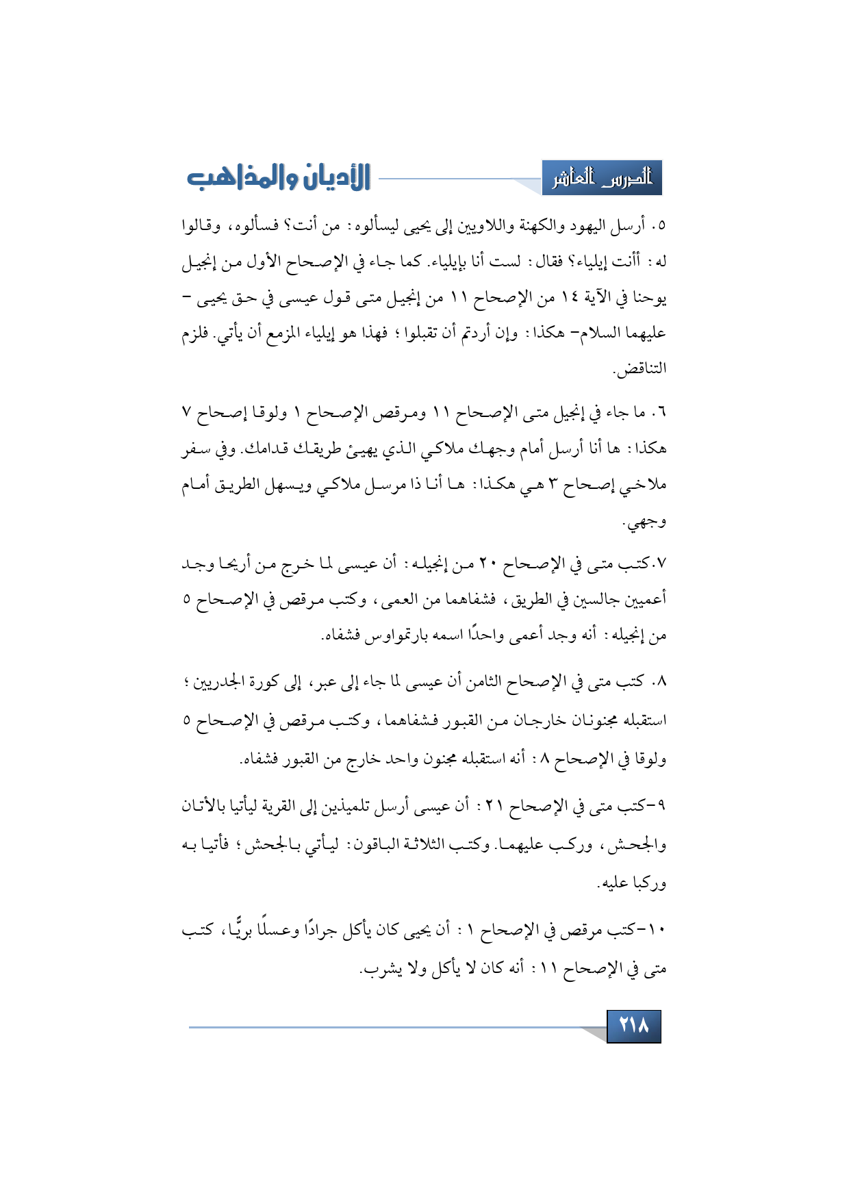 - أرسل اليهود والكهنة واللاويين إلى يحيى ليسألوه: من أنت؟ فسألوه، وقالوا له: أأنت إيلياء؟ فقال: لست أنا بإيلياء. كما جاء في الإصحاح الأول من إنجيل يوحنا في الآية 14 من الإصحاح 11 من إنجيل متى قول عيسى في حق يحيى -عليهما السلام- هكذا: وإن أردتم أن تقبلوا؛ فهذا هو إيلياء المزمع أن يأتي. فلزم التناقض.