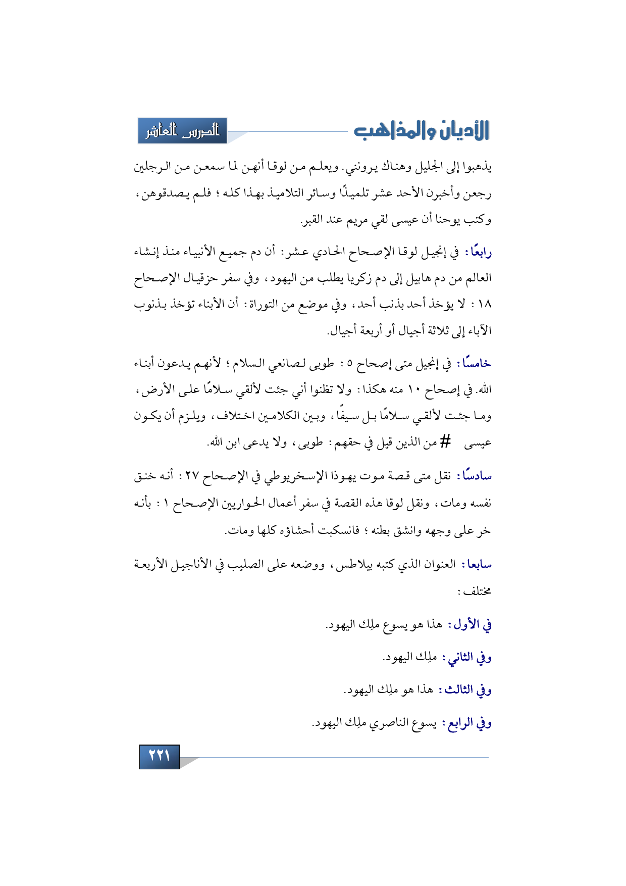 - في إنجيل متى إصحاح 5: طوبى لصانعي السلام؛ لأنهم يدعون أبناء الله. في إصحاح 10 منه هكذا: ولا تظنوا أني جئت لألقي سلامًا على الأرض، وما جئت لألقي سلامًا بل سيفًا، وبين الكلامين اختلاف، ويلزم أن يكون عيسى -عليه السلام- من الذين قيل في حقهم: طوبى، ولا يدعى ابن الله.
