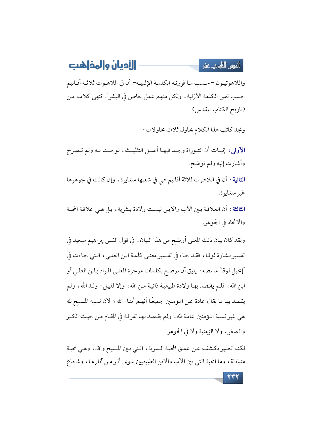 وثانيهما: أن في اللاهوت ثلاثة أقانيم هي في شعبها متغايرة، وإن كانت في جوهرها غير متغايرة.