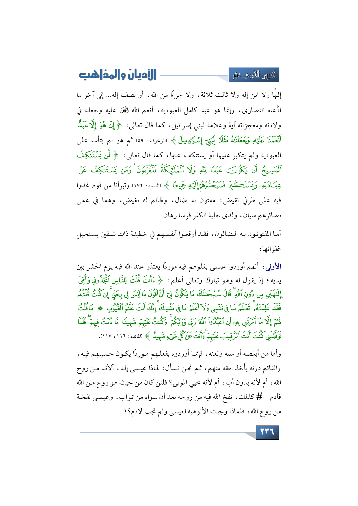 إلهًا ولا ابن إله ولا ثالث ثلاثة، ولا جزءًا من الله، أو نصف إله ... إلى آخر ما ادعاه النصارى، وإنما هو عبد كامل العبودية، أنعم الله -عز وجل- عليه وجعله في ولادته ومعجزاته آية وعلامة لبني إسرائيل، كما قال تعالى: {إِنْ هُوَ إِلَّا عَبْدٌ أَنْعَمْنَا عَلَيْهِ وَجَعَلْنَاهُ مَثَلًا لِبَنِي إِسْرَائِيلَ} (الزخرف: 59) ثم هو لم يتأب على العبودية ولم يتكبر عليها أو يستنكف عنها، كما قال تعالى: {لَنْ يَسْتَنْكِفَ الْمَسِيحُ أَنْ يَكُونَ عَبْدًا لِلَّهِ وَلَا الْمَلَائِكَةُ الْمُقَرَّبُونَ وَمَنْ يَسْتَنْكِفْ عَنْ عِبَادَتِهِ وَيَسْتَكْبِرْ فَسَيَحْشُرُهُمْ إِلَيْهِ جَمِيعًا} (النساء: 172) وتبرأنا من قوم غدوا فيه على طرفي نقيض: مفتون به ضال، وظالم له بغيض، وهما في عمى بصائرهم سيان، ولدى حلبة الكفر فرسا رهان.
