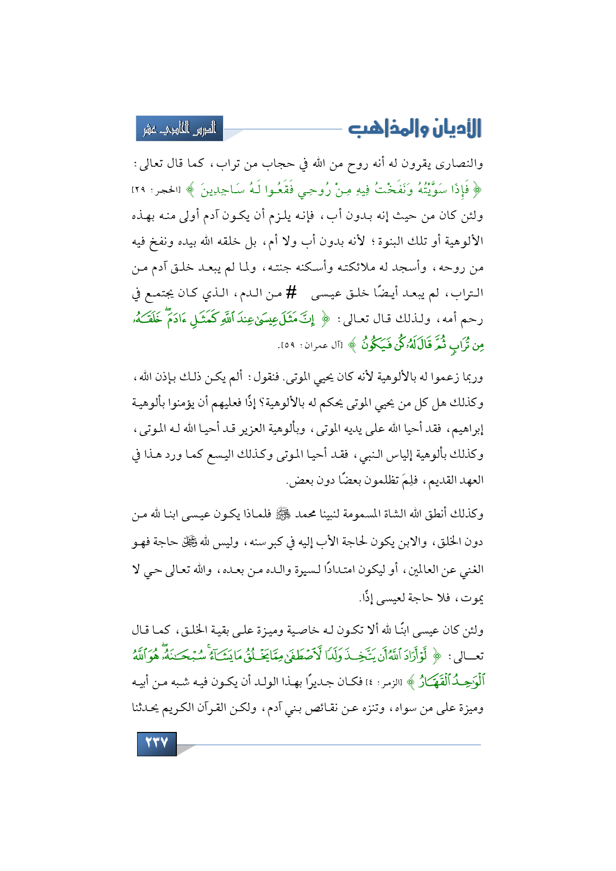 والنصارى يقرون له أنه روح من الله في حجاب من تراب، كما قال تعالى: {فَإِذَا سَوَّيْتُهُ وَنَفَخْتُ فِيهِ مِنْ رُوحِي فَقَعُوا لَهُ سَاجِدِينَ} (الحجر: 29) ولئن كان من حيث إنه بدون أب، فإنه يلزم أن يكون آدم أولى منه بهذه الألوهية أو تلك البنوة؛ لأنه بدون أب ولا أم، بل خلقه الله بيده ونفخ فيه من روحه، وأسجد له ملائكته وأسكنه جنته، ولما لم يبعد خلق آدم من التراب، لم يبعد أيضًا خلق عيسى -عليه السلام- من الدم، الذي كان يجتمع في رحم أمه، ولذلك قال تعالى: {إِنَّ مَثَلَ عِيسَى عِنْدَ اللَّهِ كَمَثَلِ آدَمَ خَلَقَهُ مِنْ تُرَابٍ ثُمَّ قَالَ لَهُ كُنْ فَيَكُونُ} (آل عمران: 59).