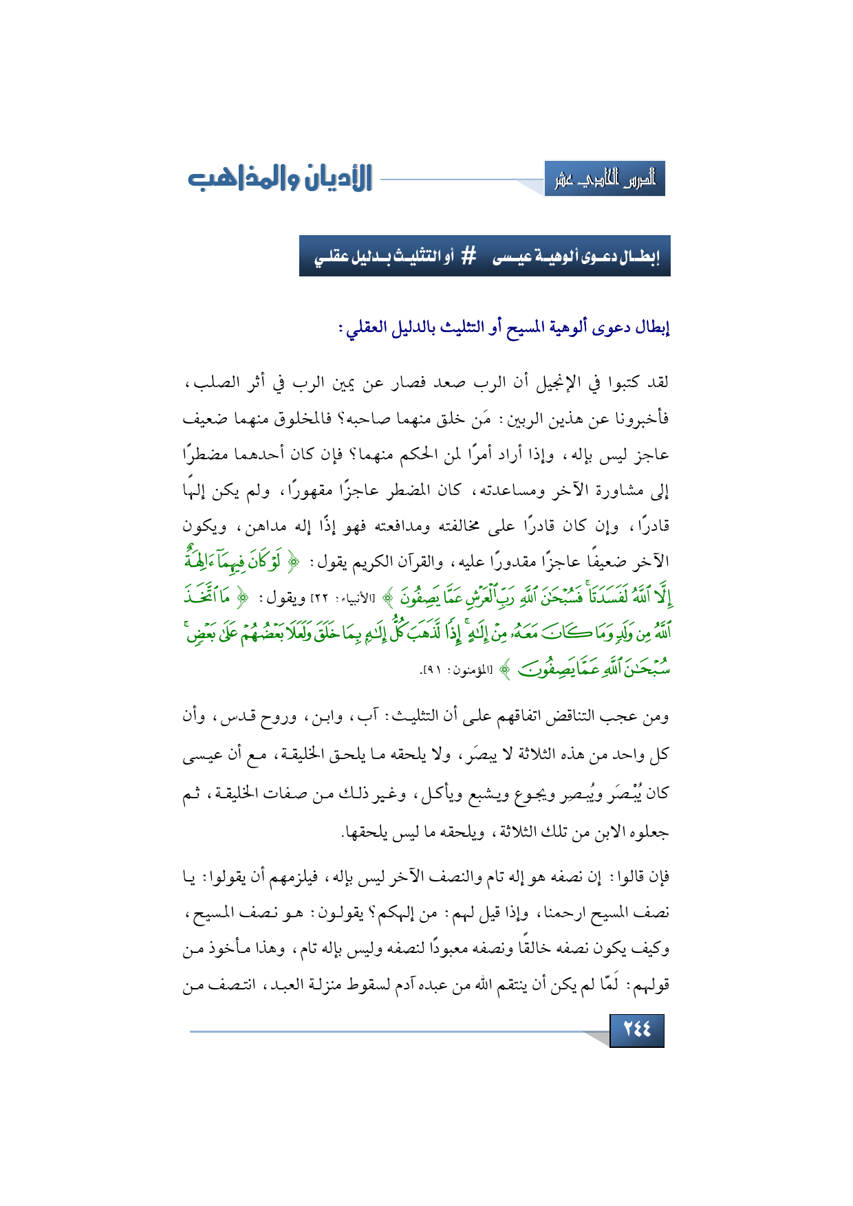 لقد كتبوا في الإنجيل أن الرب صعد فصار عن يمين الرب في أثر الصلب، فأخبرونا عن هذين الربين: مَن خلق منهما صاحبه؟ فالمخلوق منهما ضعيف عاجز ليس بإله، وإذا أراد أمرًا لمن الحكم منهما؟ فإن كان أحدهما مضطرًا إلى مشاورة الآخر ومساعدته، كان المضطر عاجزًا مقهورًا، ولم يكن إلهًا قادرًا، وإن كان قادرًا على مخالفته ومدافعته فهو إذًا إله مداهن، ويكون الآخر ضعيفًا عاجزًا مقدورًا عليه، والقرآن الكريم يقول: {لَوْ كَانَ فِيهِمَا آلِهَةٌ إِلَّا اللَّهُ لَفَسَدَتَا} (الأنبياء: 22) ويقول: {مَا اتَّخَذَ اللَّهُ مِنْ وَلَدٍ وَمَا كَانَ مَعَهُ مِنْ إِلَهٍ إِذًا لَذَهَبَ كُلُّ إِلَهٍ بِمَا خَلَقَ وَلَعَلَا بَعْضُهُمْ عَلَى بَعْضٍ سُبْحَانَ اللَّهِ عَمَّا يَصِفُونَ} (المؤمنون: 91).