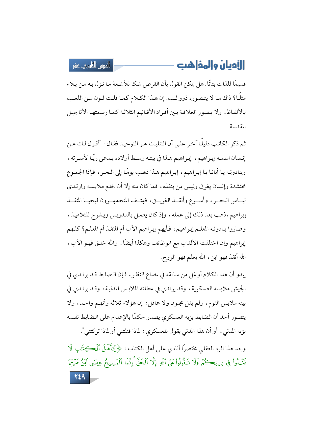 ذهب بعد ذلك إلى عمله، وإذ كان يعمل بالتدريس ويشرح للتلاميذ، وصاروا ينادونه المعلم إبراهيم، فأيهم إبراهيم الأب أم المنقذ أم المعلم؟ كلهم إبراهيم وإن اختلفت الألقاب مع الوظائف وهكذا أيضًا، والله خلق فهو الأب، الله أنقذ فهو ابن، الله يعلم فهو الروح.