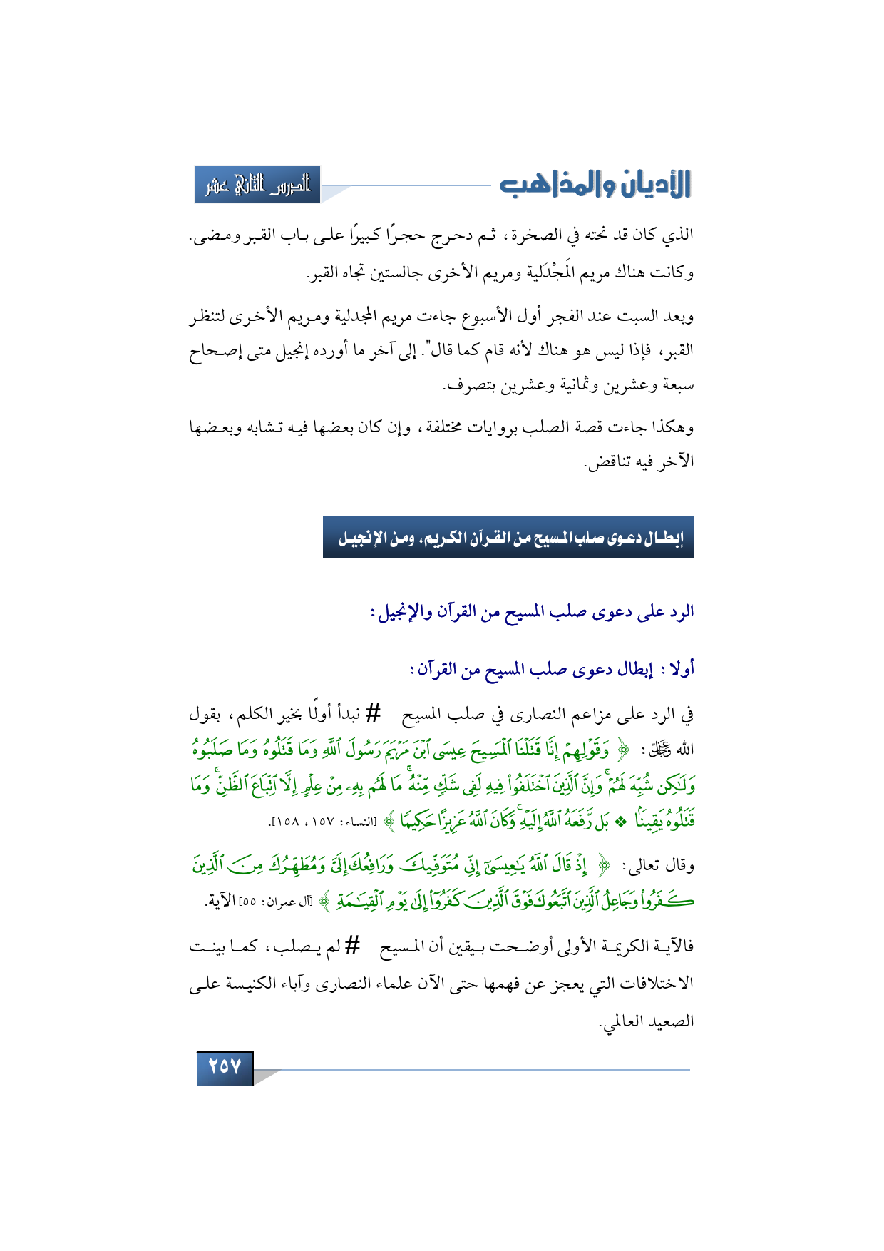 فالآية الكريمة الأولى أوضحت بيقين أن المسيح -عليه السلام- لم يصلب، كما بينت الاختلافات التي يعجز عن فهمها حتى الآن علماء النصارى وآباء الكنيسة على الصعيد العالمي،