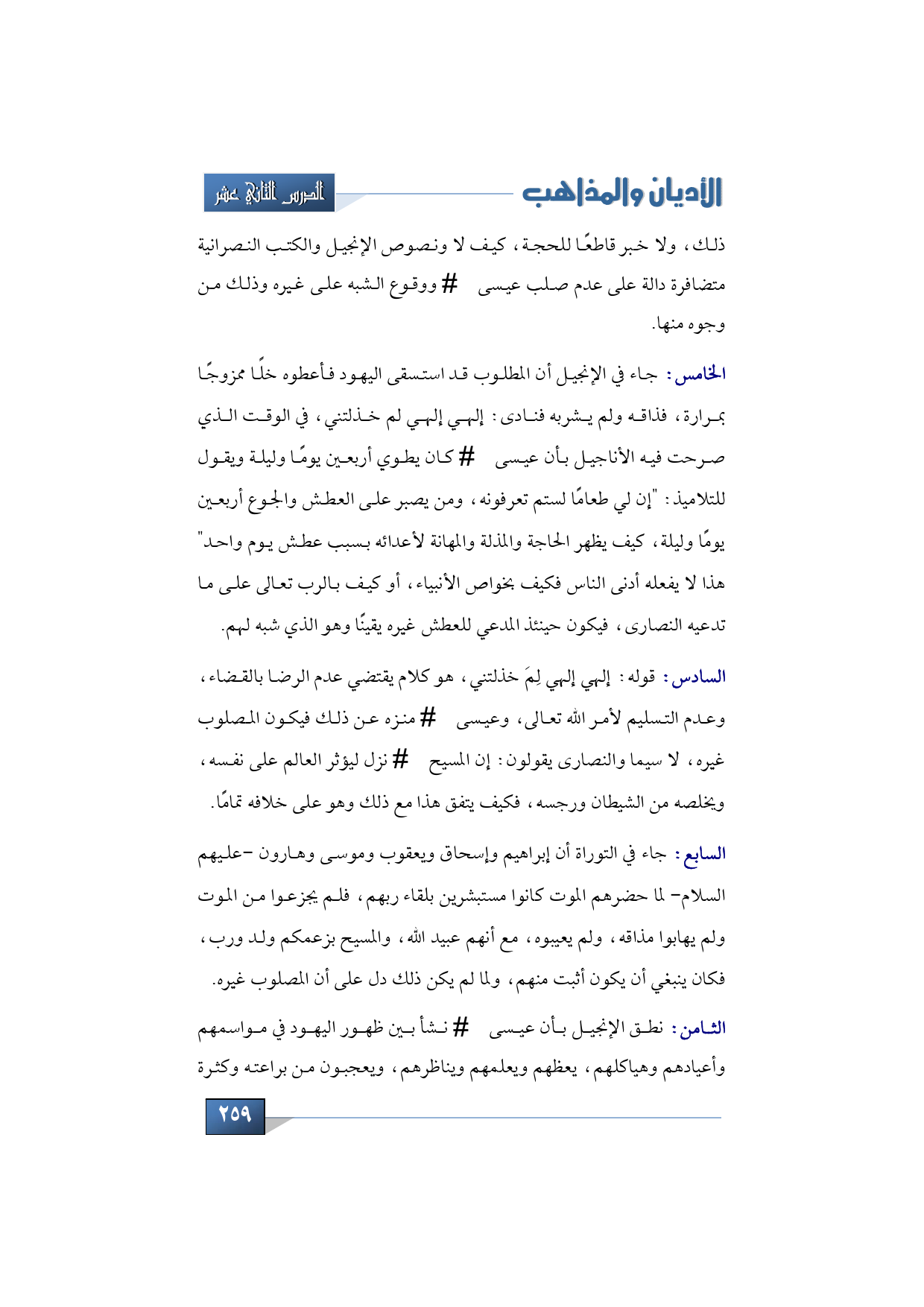 السادس: قوله: إلهي إلهي لِمَ خذلتني، هو كلام يقتضي عدم الرضا بالقضاء، وعدم التسليم لأمر الله تعالى، وعيسى -عليه السلام- منزه عن ذلك فيكون المصلوب غيره، لا سيما والنصارى يقولون: إن المسيح -عليه السلام- نزل ليؤثر العالم على نفسه، ويخلصه من الشيطان ورجسه، فكيف يتفق هذا مع ذلك وهو على خلافه تمامًا.