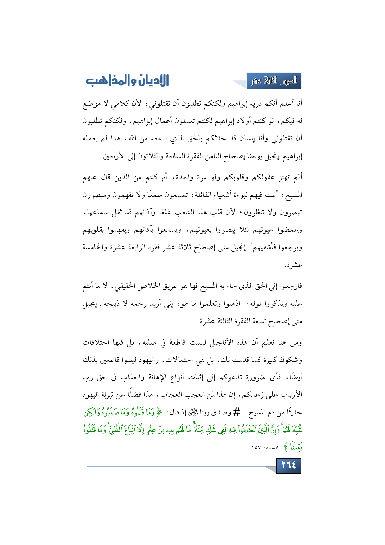 أنا أعلم أنكم ذرية إبراهيم ولكنكم تطلبون أن تقتلوني؛ لأن كلامي لا موضع له فيكم، لو كنتم أولاد إبراهيم لكنتم تعملون أعمال إبراهيم، ولكنكم تطلبون أن تقتلوني وأنا إنسان قد حدثكم بالحق الذي سمعه من الله، هذا لم يعمله إبراهيم. إنجيل يوحنا إصحاح الثامن الفقرة السابعة والثلاثون إلى الأربعين.
