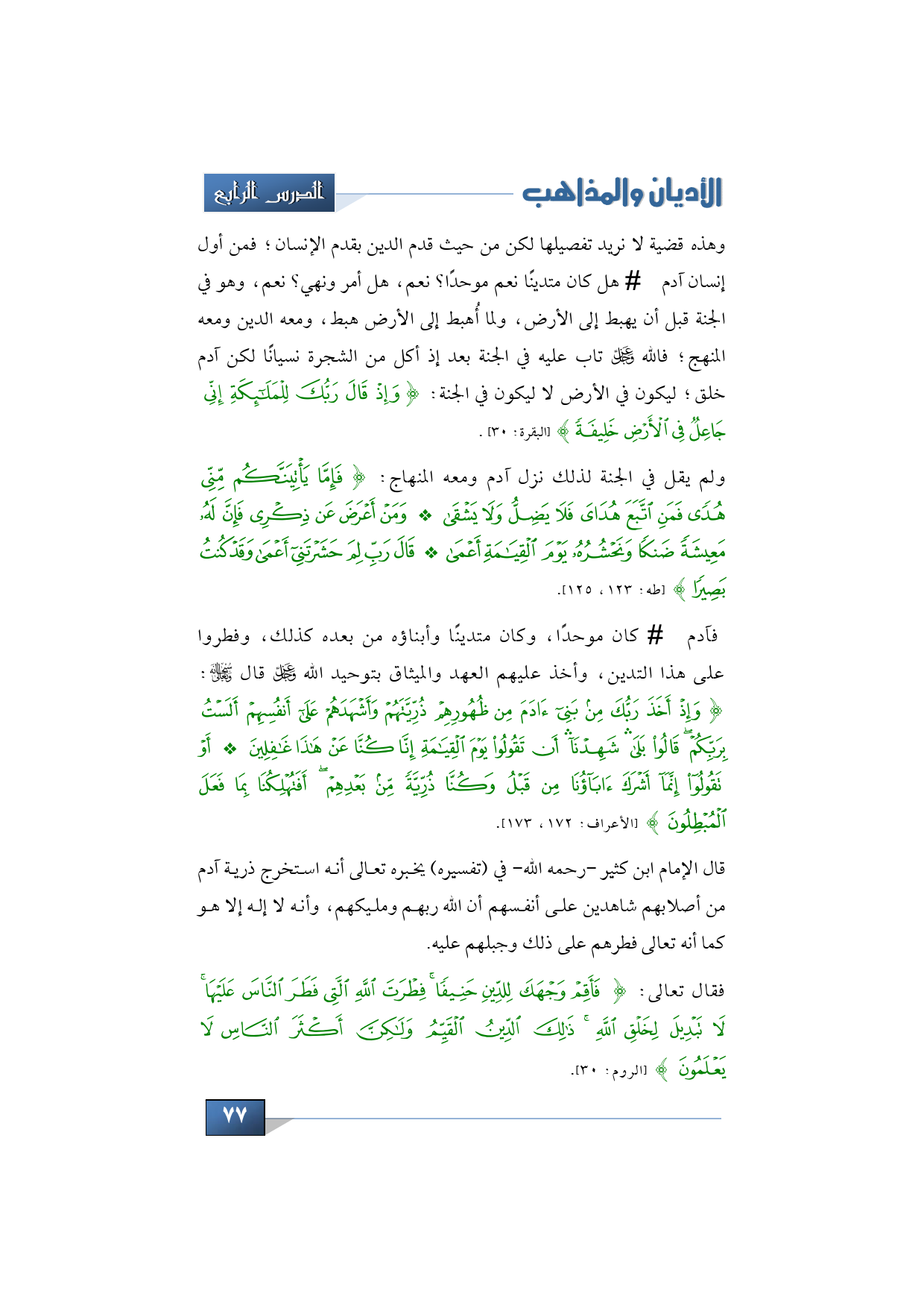 وهذه قضية لا نريد تفصيلها لكن من حيث قدم الدين بقدم الإنسان؛ فمن أول إنسان آدم -عليه السلام- هل كان متدينًا نعم موحدًا؟ نعم، هل أمر ونهي؟ نعم وهو في الجنة قبل أن يهبط إلى الأرض، ولما أهبط إلى الأرض هبط، ومعه الدين ومعه المنهج؛ فالله -عز وجل- تاب عليه في الجنة بعد إذ أكل من الشجرة نسيانًا لكن آدم خلق ليكون في الأرض لا ليكون في الجنة: {وَإِذْ قَالَ رَبُّكَ لِلْمَلَائِكَةِ إِنِّي جَاعِلٌ فِي الْأَرْضِ خَلِيفَةً} (البقرة: 30) ولم يقل في الجنة لذلك نزل آدم ومعه المنهاج: {فَإِمَّا يَأْتِيَنَّكُمْ مِنِّي هُدًى فَمَنِ اتَّبَعَ هُدَايَ فَلَا يَضِلُّ وَلَا يَشْقَى * وَمَنْ أَعْرَضَ عَنْ ذِكْرِي فَإِنَّ لَهُ مَعِيشَةً ضَنْكًا * وَنَحْشُرُهُ يَوْمَ الْقِيَامَةِ أَعْمَى} (طه: 123، 125).