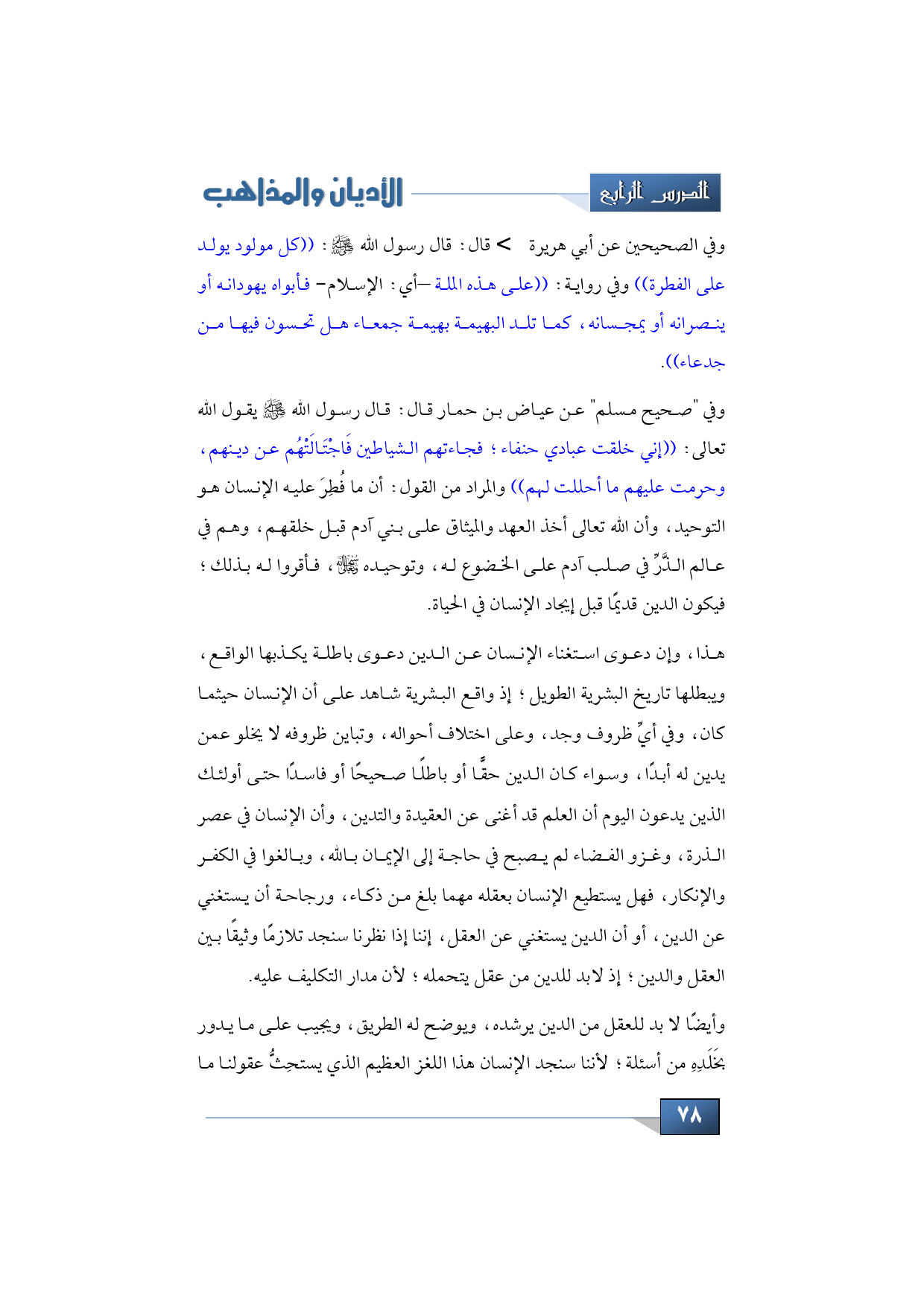 وفي الصحيحين عن أبي هريرة -رضي الله عنه- قال: قال رسول الله -صلى الله عليه وسلم-: ((كل مولود يولد على الفطرة)) وفي رواية: ((على هذه الملة -أي الإسلام- فأبواه يهودانه أو ينصرانه أو يمجسانه، كما تلد البهيمة بهيمة جمعاء هل تحسون فيها من جدعاء)).