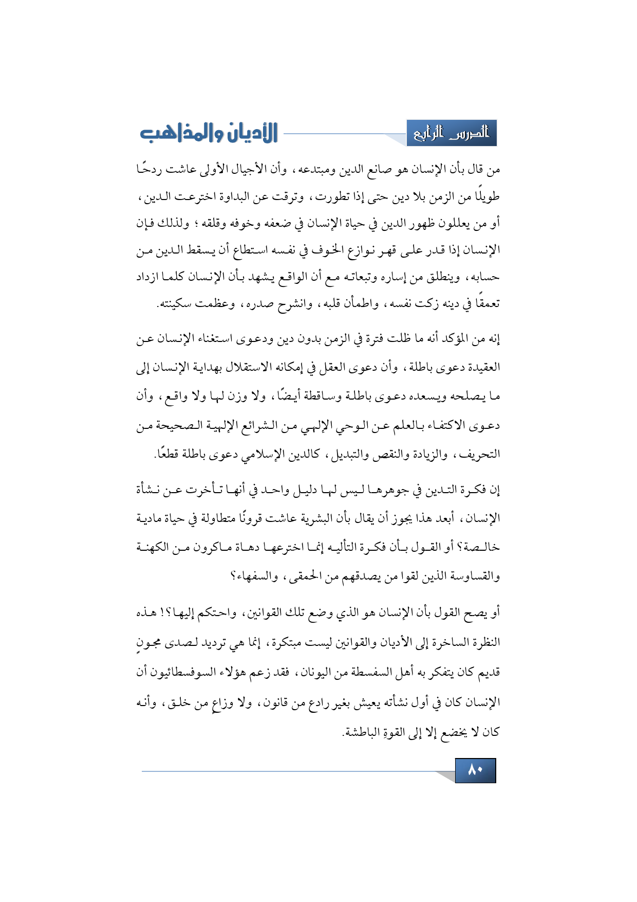 إن فكرة التدين في جوهرها ليس لها دليل واحد في أنها تأخرت عن نشأة الإنسان أبعد هذا يجوز أن يقال: بأن البشرية عاشت قرونًا متطاولة في حياة مادية خالصة؟ أو القول: بأن فكرة التأليه إنما اخترعها دهاة ماكرون من الكهنة والقساوسة الذين لقوا من يصدقهم من الحمقى، والسفهاء؟ أو يصح القول بأن الإنسان هو الذي وضع تلك القوانين، واحتكم إليها؟! هذه النظرة الساخرة إلى الأديان والقوانين ليست مبتكرة، إنما هي ترديد لصدى مجونٍ قديم كان يتفكر به أهل السفسطة من اليونان، فقد زعم هؤلاء السوفسطائيون: أن الإنسان كان في أول نشأته يعيش بغير رادع من قانون، ولا وزاعٍ من خلق، وأنه كان لا يخضع إلا إلى القوةِ الباطشة.