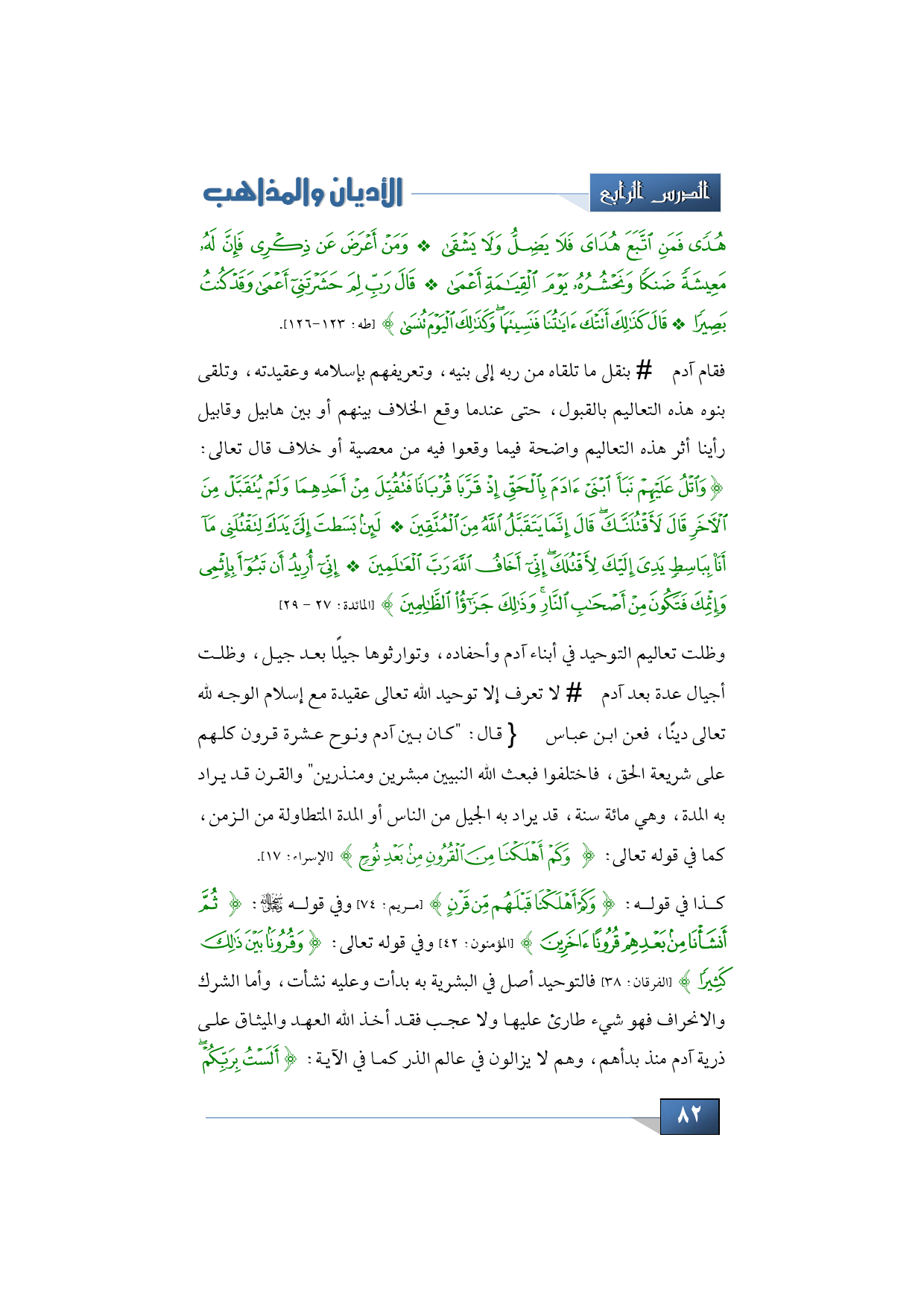 كذا في قوله: {وَكَمْ أَهْلَكْنَا قَبْلَهُمْ مِنْ قَرْنٍ} (مريم: 74) وفي قوله سبحانه: {ثُمَّ أَنْشَأْنَا مِنْ بَعْدِهِمْ قُرُونًا آخَرِينَ} (المؤمنون: 42) وفي قوله تعالى: {وَقُرُونًا بَيْنَ ذَلِكَ كَثِيرًا} (الفرقان: 38) فالتوحيد أصل في البشرية به بدأت وعليه نشأت، وأما الشرك والانحراف فهو شيء طارئ عليها ولا عجب فقد أخذ الله العهد والميثاق على ذرية آدم منذ بدأهم، وهم لا يزالون في عالم الذر كما في الآية: {أَلَسْتُ بِرَبِّكُمْ