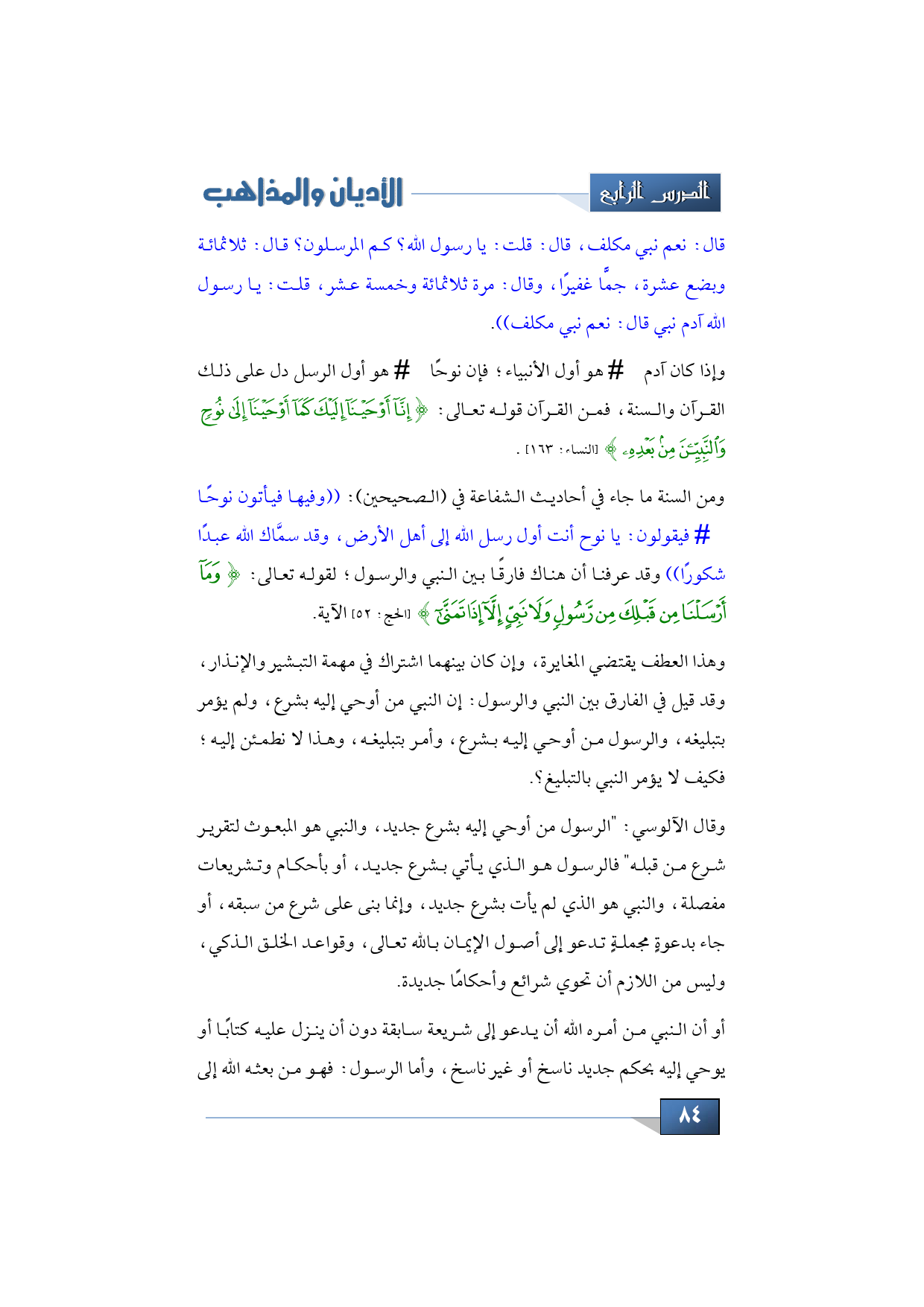 ومن السنة ما جاء في أحاديث الشفاعة في (الصحيحين): ((وفيها فيأتون نوحًا -عليه السلام- فيقولون: يا نوح أنت أول رسل الله إلى أهل الأرض، وقد سمَّاك الله عبدًا شكورا)) وقد علم: أن هناك فارقًا بين النبي والرسول؛ لقوله تعالى: {وَمَا أََرْسَلْنا مِنْ قبلِك مِنْ رَسُولٍ وَلَا نَبِيٍّ إلاَّ إذَا تَمَنَّى} (الحج: 52) الآية.