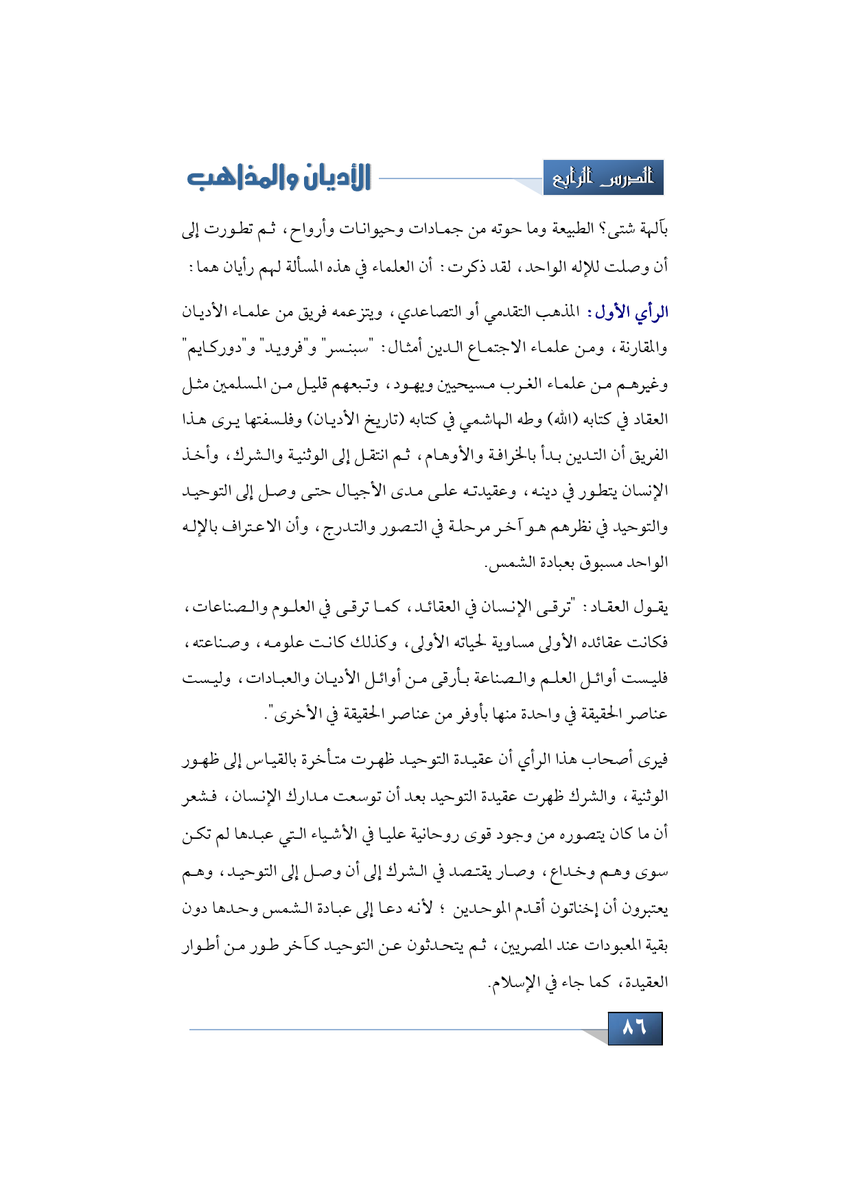 الرأي الأول: المذهب التقدمي أو التصاعدي، ويتزعمه فريق من علماء الأديان والمقارنة، ومن علماء الاجتماع الدين أمثال: "سبنسر" و"فرويد" و"دوركايم" وغيرهم من علماء الغرب مسيحيين ويهود، وتبعهم قليل من المسلمين مثل العقاد في كتابه (الله) وطه الهاشمي في كتابه (تاريخ الأديان) وفلسفتها يرى هذا الفريق أن التدين بدأ بالخرافة والأوهام، ثم انتقل إلى الوثنية والشرك، وأخذ الإنسان يتطور في دينه، وعقيدته على مدى الأجيال حتى وصل إلى التوحيد والتوحيد في نظرهم هو آخر مرحلة في التصور والتدرج، وأن الاعتراف بالإله الواحد مسبوق بعبادة الشمس.