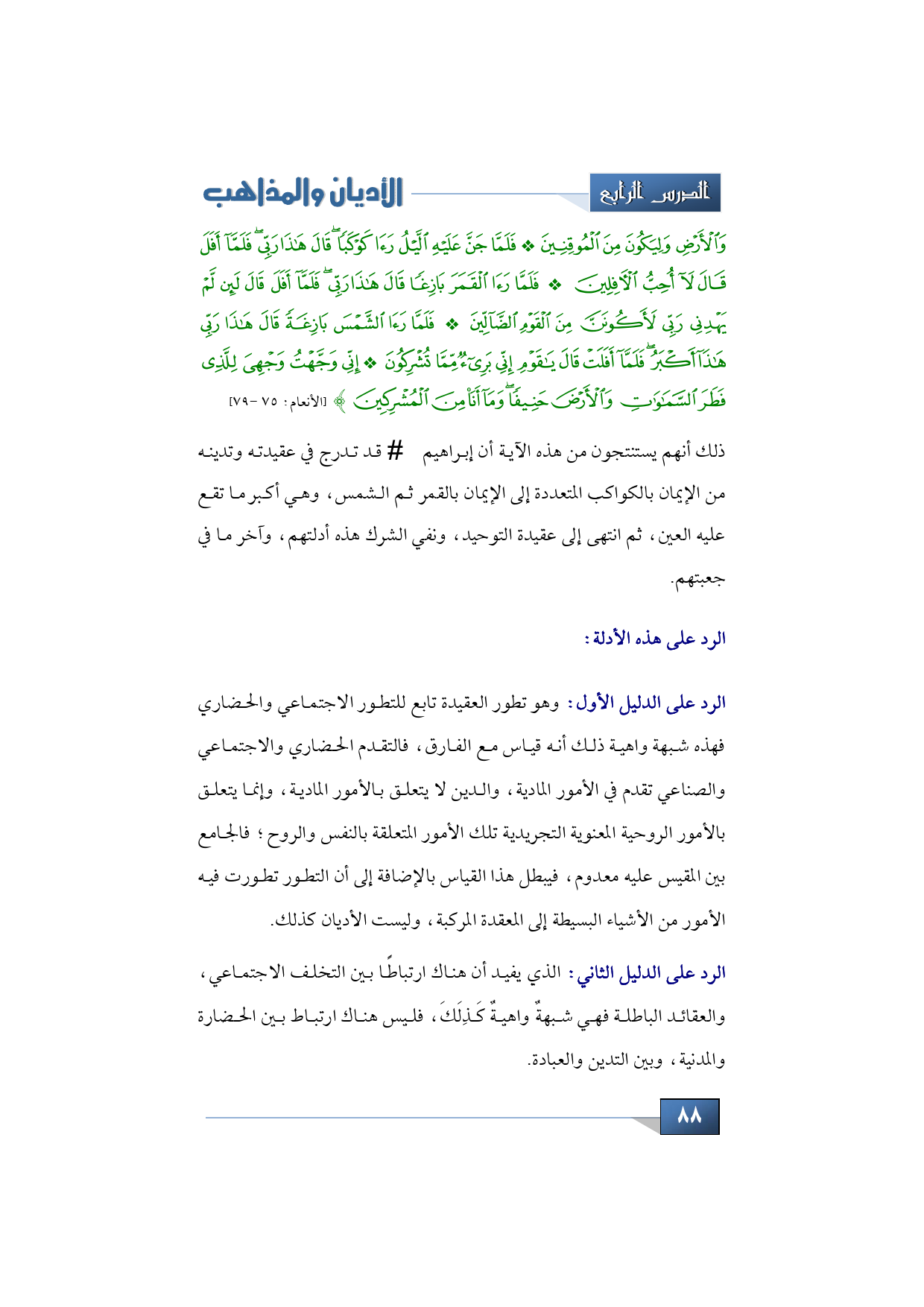 وَالْأَرْضِ وَلِيَكُونَ مِنَ الْمُوقِنِينَ * فَلَمَّا جَنَّ عَلَيْهِ اللَّيْلُ رَأَى كَوْكَبًا قَالَ هَذَا رَبِّي فَلَمَّا أَفَلَ قَالَ لَا أُحِبُّ الْآفِلِينَ فَلَمَّا رَأَى الْقَمَرَ بَازِغًا قَالَ هَذَا رَبِّي فَلَمَّا أَفَلَ قَالَ لَئِنْ لَمْ يَهْدِنِي رَبِّي لَأَكُونَنَّ مِنَ الْقَوْمِ الضَّالِّينَ* فَلَمَّا رَأَى الشَّمْسَ بَازِغَةً قَالَ هَذَا رَبِّي هَذَا أَكْبَرُ فَلَمَّا أَفَلَتْ قَالَ يَا قَوْمِ إِنِّي بَرِيءٌ مِمَّا تُشْرِكُونَ *إِنِّي وَجَّهْتُ وَجْهِيَ لِلَّذِي فَطَرَ السَّمَاوَاتِ وَالْأَرْضَ حَنِيفًا وَمَا أَنَا مِنَ الْمُشْرِكِينَ} (الأنعام: 75 - 79) الآيات.