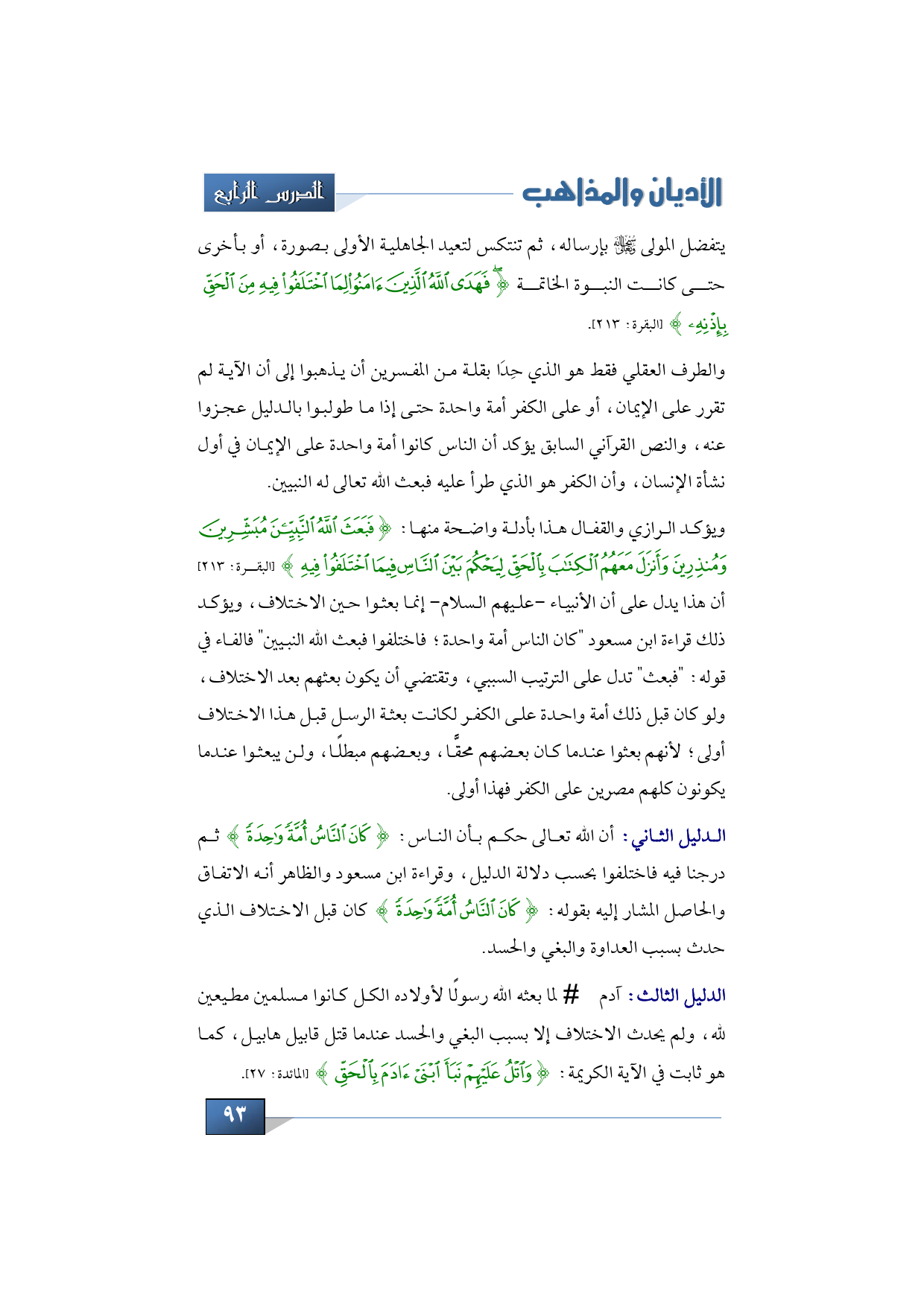 دليل آخر أن الله تعالى حكم بأن الناس: {كَانَ النَّاسُ أُمَّةً وَاحِدَةً} ثم درجنا فيه فاختلفوا بحسب دلالة الدليل، وقراءة ابن مسعود والظاهر أنه الاتفاق والحاصل المشار إليه بقوله: {كَانَ النَّاسُ أُمَّةً وَاحِدَةً} كان قبل الاختلاف الذي حدث بسبب العداوة والبغي والحسد، دليل ثالث آدم -عليه السلام- لما بعثه الله رسولًا لأولاده الكل كانوا مسلمين مطيعين لله، ولم يحدث الاختلاف إلا بسبب البغي والحسد عندما قتل قابيل هابيل، كما هو ثابت في الآية الكريمة: {وَاتْلُ عَلَيْهِمْ نَبَأَ ابْنَيْ آدَمَ بِالْحَقِّ} (المائدة: 27).