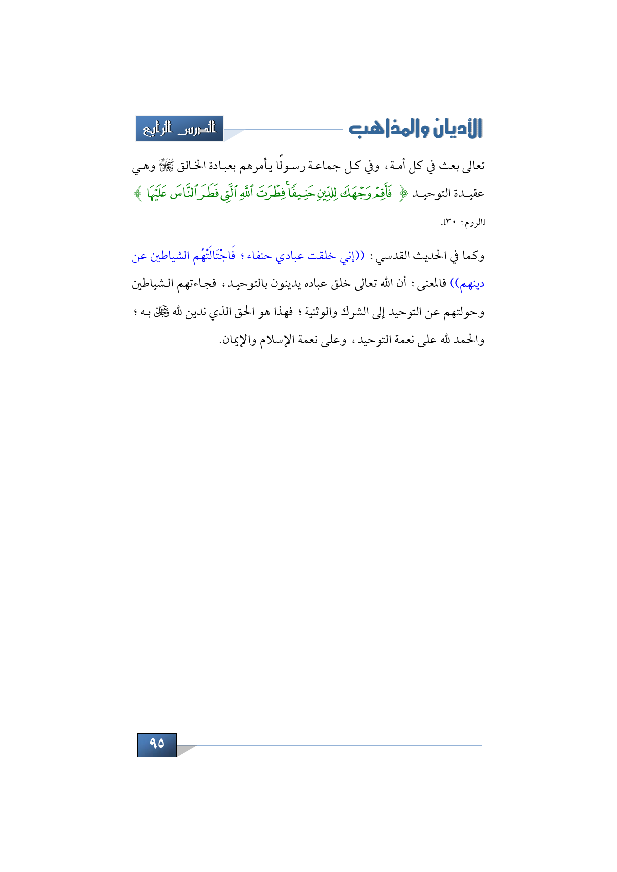 وكما في الحديث القدسي: ((إني خلقت عبادي حنفاء؛ فَاجْتَالَتْهُم الشياطين عن دينهم)) فالمعنى: أن الله تعالى خلق عباده يدينون بالتوحيد، فجاءتهم الشياطين وحولتهم عن التوحيد إلى الشرك والوثنية؛ فهذا هو الحق الذي ندين لله -عز وجل- به؛ والحمد لله على نعمة التوحيد، وعلى نعمة الإسلام والإيمان.
