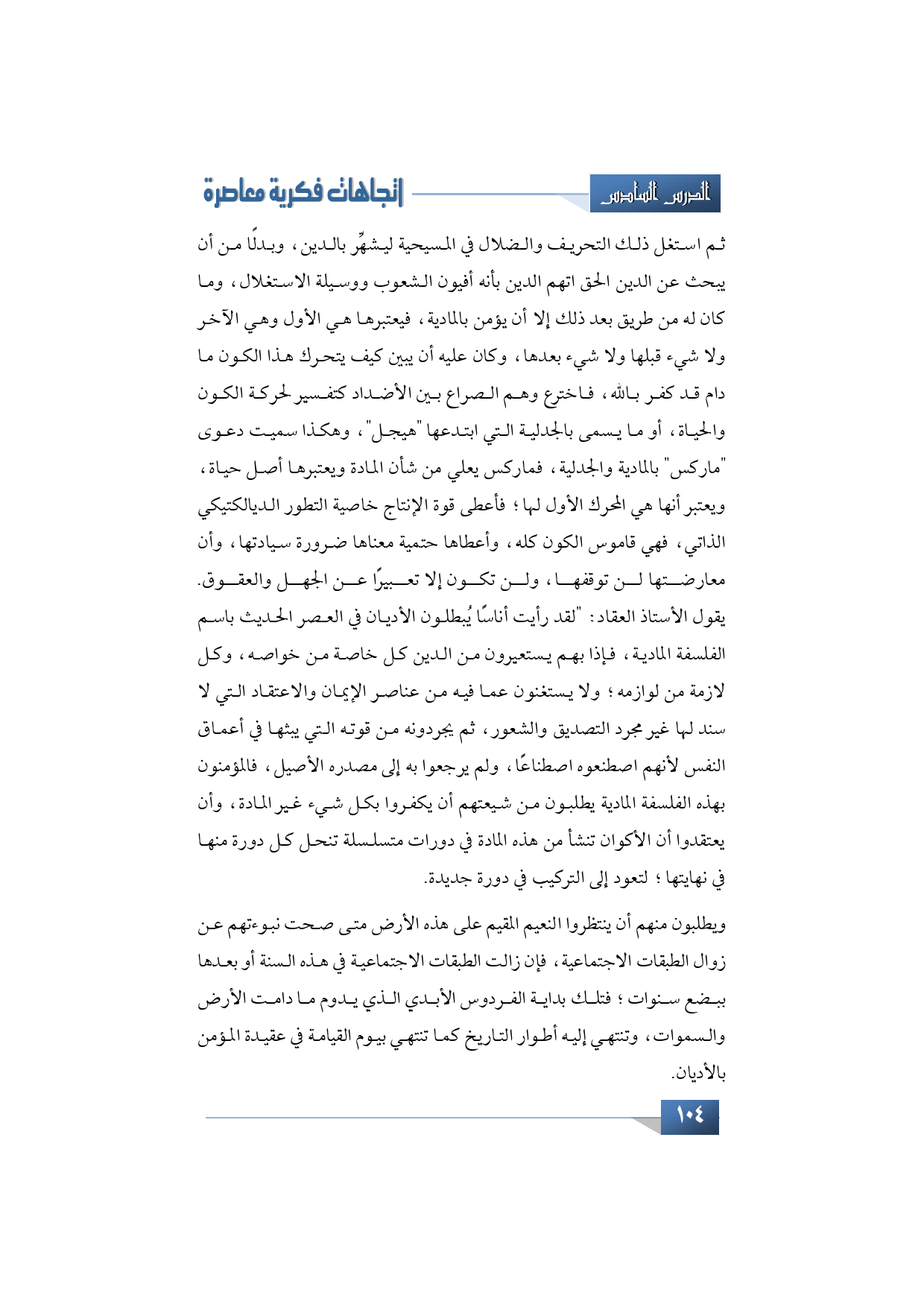 ثم استغل ذلك التحريف والضلال في المسيحية ليشهِّر بالدين، وبدلًا من أن يبحث عن الدين الحق اتهم الدين بأنه أفيون الشعوب ووسيلة الاستغلال، وما كان له من طريق بعد ذلك إلا أن يؤمن بالمادية، فيعتبرها هي الأول وهي الآخر ولا شيء قبلها ولا شيء بعدها، وكان عليه أن يبين كيف يتحرك هذا الكون ما دام قد كفر بالله، فاخترع وهم الصراع بين الأضداد كتفسير لحركة الكون والحياة، أو ما يسمى بالجدلية التي ابتدعها "هيجل"، وهكذا سميت دعوى "ماركس" بالمادية والجدلية، فماركس يعلي من شأن المادة ويعتبرها أصل حياة، ويعتبر أنها هي المحرك الأول لها؛ فأعطى قوة الإنتاج خاصية التطور الديالكتيكي الذاتي، فهي قاموس الكون كله، وأعطاها حتمية معناها ضرورة سيادتها، وأن معارضتها لن توقفها، ولن تكون إلا تعبيرًا عن الجهل والعقوق.