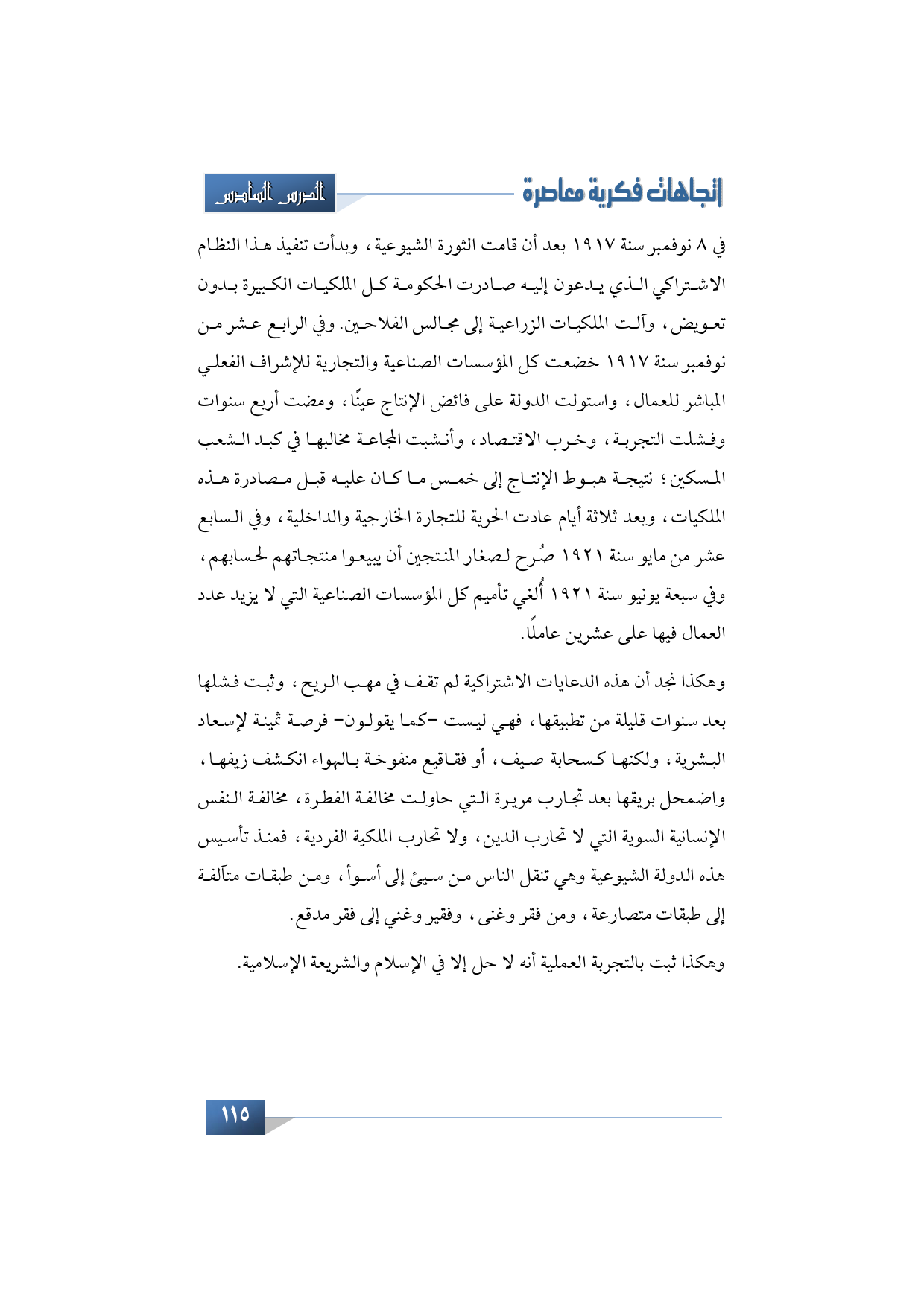 في 8 نوفمبر سنة 1917 بعد أن قامت الثورة الشيوعية، وبدأت تنفيذ هذا النظام الاشتراكي الذي يدعونا إليه صادرت الحكومة كل الملكيات الكبيرة بدون تعويض، وآلت الملكيات الزراعية إلى مجالس الفلاحين. وفي الرابع عشر من نوفمبر سنة 1917 خضعت كل المؤسسات الصناعية والتجارية للإشراف الفعلي المباشر للعمال، واستولت الدولة على فائض الإنتاج عينًا، ومضت أربع سنوات وفشلت التجربة، وخرب الاقتصاد، وأنشبت المجاعة مخالبها في كبد الشعب المسكين؛ نتيجة هبوط الإنتاج إلى خمس ما كان عليه قبل مصادرة هذه الملكيات، وبعد ثلاثة أيام عادت الحرية للتجارة الخارجية والداخلية، وفي السابع عشر من مايو سنة 1921 صُرح لصغار المنتجين أن يبيعوا منتجاتهم لحسابهم، وفي سبعة يونيو سنة 1921 أُلغي تأميم كل المؤسسات الصناعية التي لا يزيد عدد العمال فيها على عشرين عاملًا.