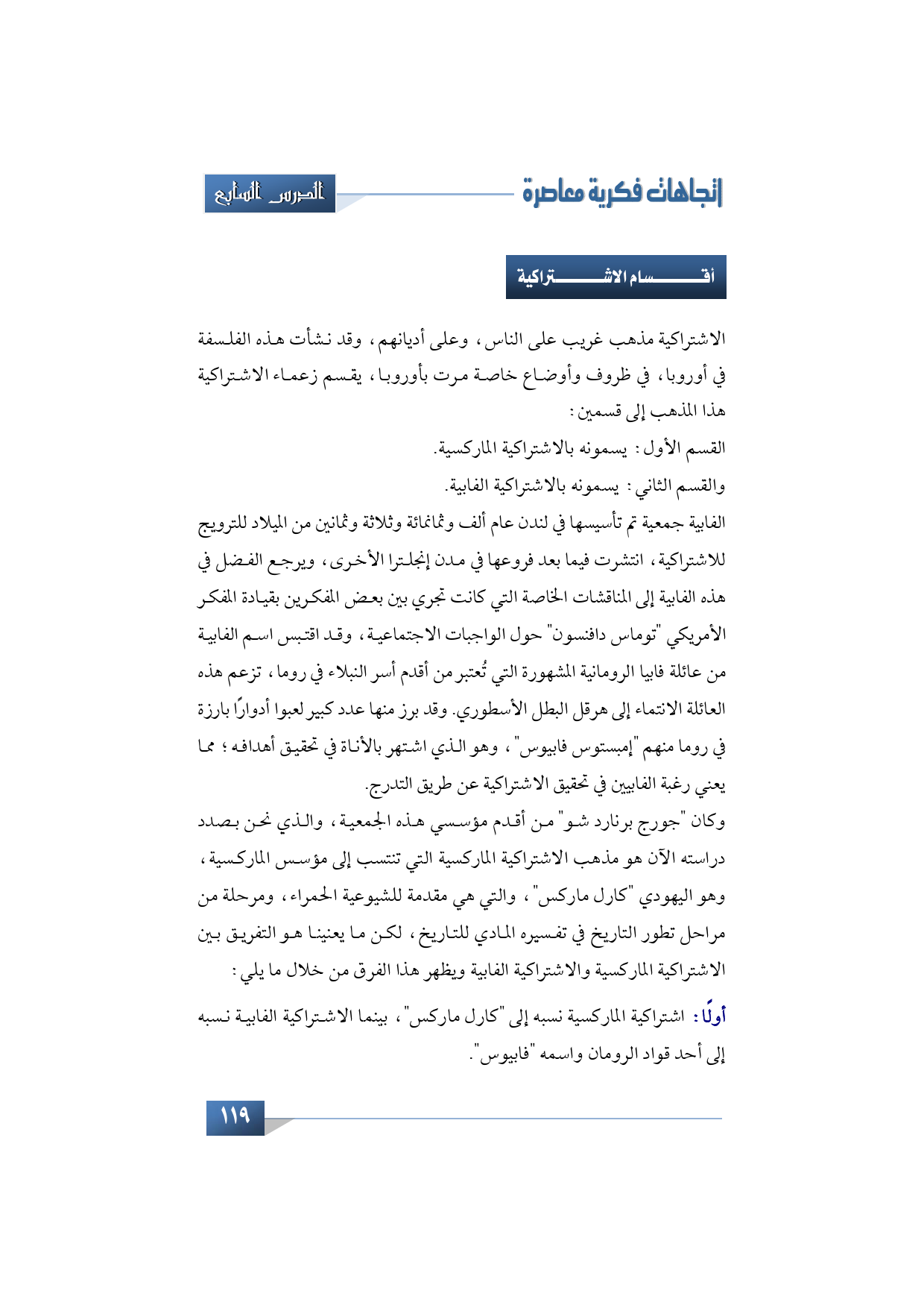 أولًا: اشتراكية الماركسية نسبه إلى "كارل ماركس"، بينما الاشتراكية الفابية نسبه إلى أحد قواد الرومان واسمه "فابيوس".