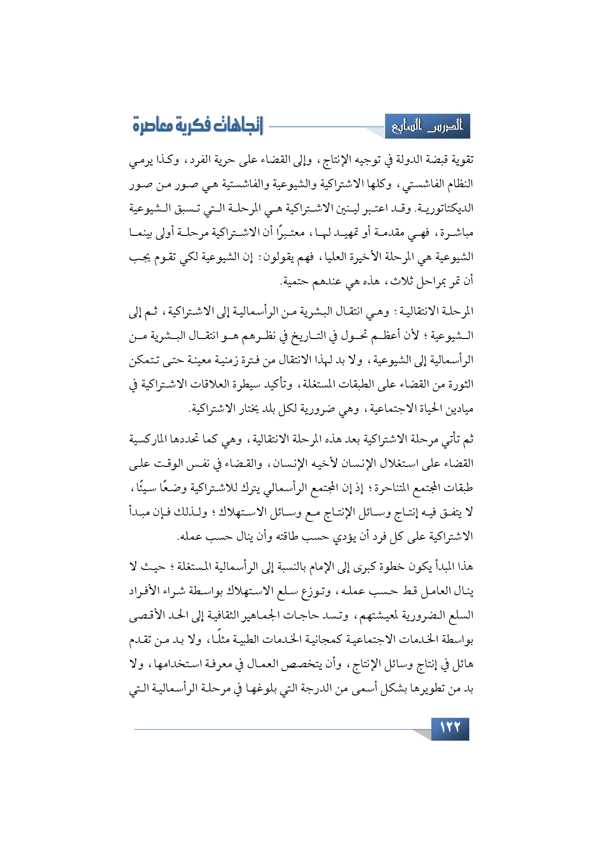 تقوية قبضة الدولة في توجيه الإنتاج، وإلى القضاء على حرية الفرد، وكذا يرمي النظام الفاشستي، وكلها الاشتراكية والشيوعية والفاشستية هي صور من صور الديكتاتورية. وقد اعتبر لينين الاشتراكية هي المرحلة التي تسبق الشيوعية مباشرة، فهي مقدمة أو تمهيد لها، معتبرًا أن الاشتراكية مرحلة أولى بينما الشيوعية هي المرحلة الأخيرة العليا، فهم يقولون: إن الشيوعية لكي تقوم يجب أن تمر بمراحل ثلاث، هذه هي عندهم حتمية.