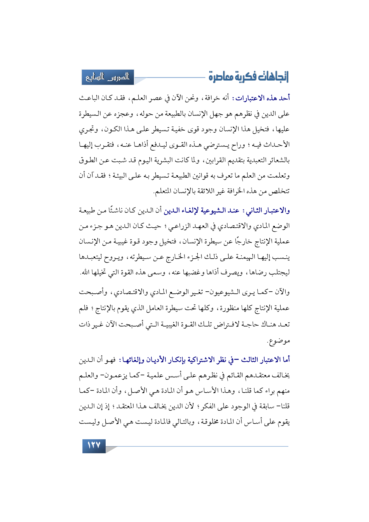 أحد هذه الاعتبارات: أنه خرافه، ونحن الآن في عصر العلم، فقد كان الباعث على الدين في نظرهم هو جهل الإنسان بالطبيعة من حوله، وعجزه عن السيطرة عليها، فتخيل هذا الإنسان وجود قوى خفية تسيطر على هذا الكون، وتجري الأحداث فيه؛ وراح يسترضي هذه القوى ليدفع أذاها عنه، فتقرب إليها بالشعائر التعبدية بتقديم القرابين، ولما كانت البشرية اليوم قد شبت عن الطوق وتعلمت من العلم ما تعرف به قوانين الطبيعة تسيطر به على البيئة؛ فقد آن أن تتخلص من هذه الخرافة غير اللائقة بالإنسان المتعلم.