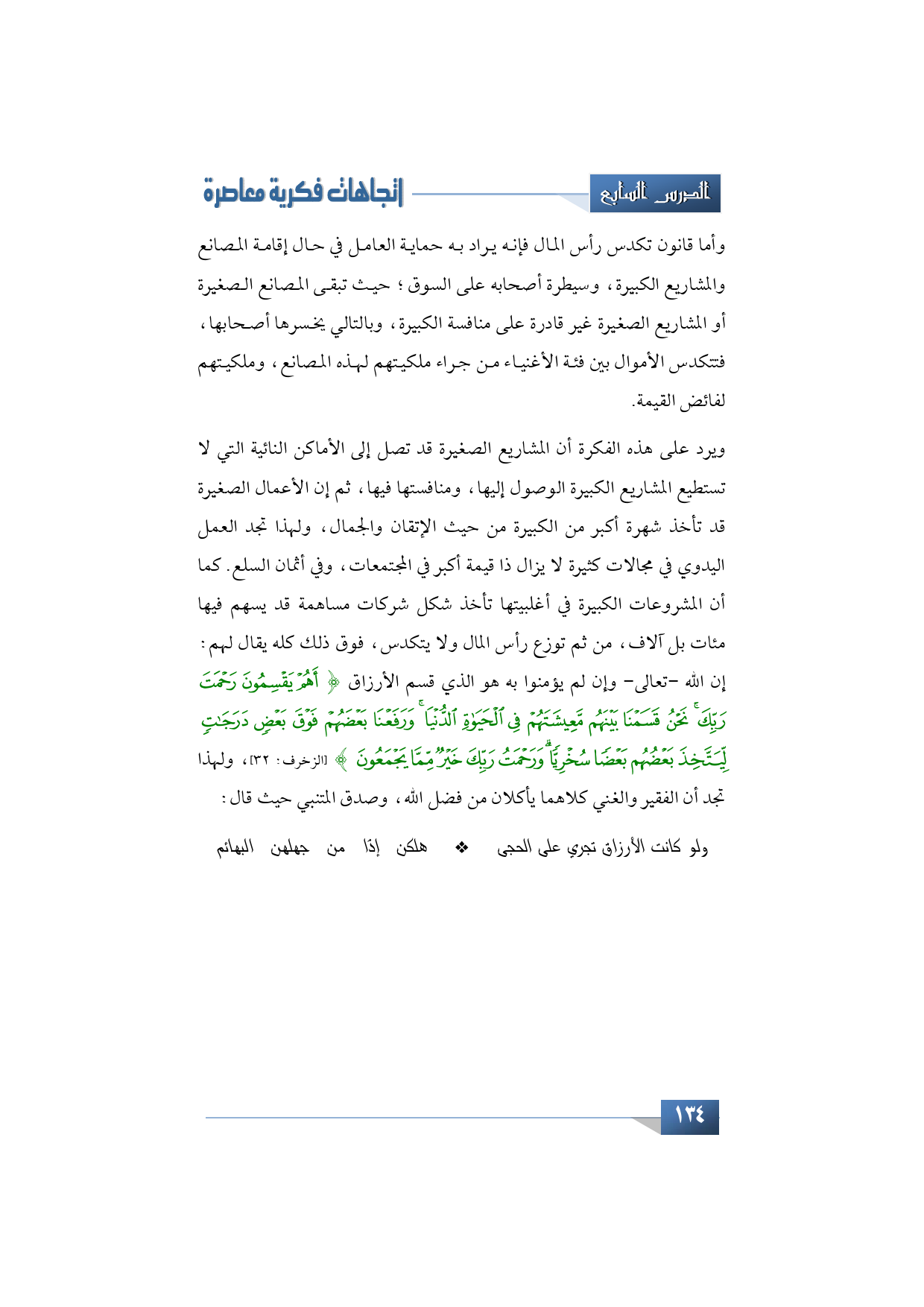 ويرد على هذه الفكرة أن المشاريع الصغيرة قد تصل إلى الأماكن النائية التي لا تستطيع المشاريع الكبيرة الوصول إليها، ومنافستها فيها، ثم إن الأعمال الصغيرة قد تأخذ شهرة أكثر من الكبيرة من حيث الإتقان والجمال، ولهذا تجد العمل اليدوي في مجالات كثيرة لا يزال ذا قيمة أكبر في المجتمعات، وفي أثمان السلع. كما أن المشروعات الكبيرة في أغلبيتها تأخذ شكل شركات مساهمة قد يسهم فيها مئات بل آلاف، من ثم توزع رأس المال ولا يتكدس، فوق ذلك كله يقال لهم: إن الله تعالى وإن لم يؤمنوا به هو الذي قسم الأرزاق {أَهُمْ يَقْسِمُونَ رَحْمَةَ رَبِّكَ نَحْنُ قَسَمْنَا بَيْنَهُمْ مَعِيشَتَهُمْ فِي الْحَيَاةِ الدُّنْيَا وَرَفَعْنَا بَعْضَهُمْ فَوْقَ بَعْضٍ دَرَجَاتٍ لِيَتَّخِذَ بَعْضُهُمْ بَعْضًا سُخْرِيًّا وَرَحْمَةُ رَبِّكَ خَيْرٌ مِمَّا يَجْمَعُونَ} (الزخرف: 32)، ولهذا تجد أن الفقير والغني كلاهما يأكلان من فضل الله، وصدق المتنبي حيث قال: