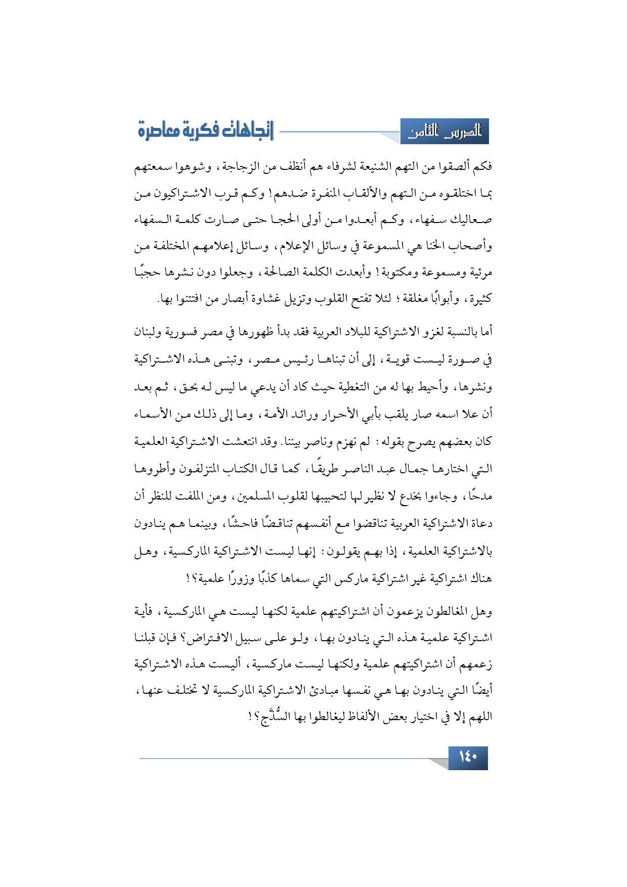 وهل المغالطون يزعمون أن اشتراكيتهم علمية لكنها ليست هي الماركسية، فأي اشتراكية علمية هذه التي ينادون بها، ولو على سبيل الافتراض فإن قبلنا زعمهم أن اشتراكيتهم علمية ولكنها ليست ماركسية، أليست هذه الاشتراكية أيضًا التي ينادون بها هي نفسها مبادئ الاشتراكية الماركسية لا تختلف عنها، اللهم إلا في اختيار بعض الألفاظ ليغالطوا بها السُّذَّج.