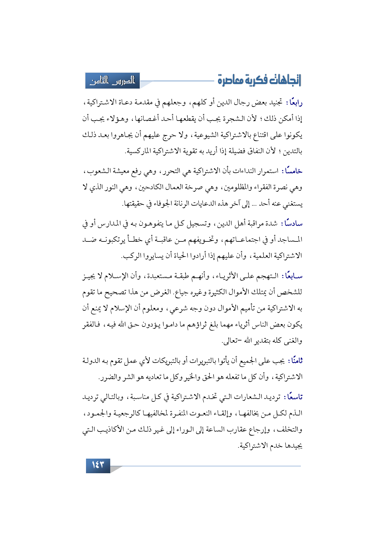 سابعًا: التهجم على الأثرياء، وأنهم طبقة مستعبدة، وأن الإسلام لا يجيز للشخص أن يمتلك الأموال الكثيرة وغيره جياع. الغرض من هذا تصحيح ما تقوم به الاشتراكية من تأميم الأموال دون وجه شرعي، ومعلوم أن الإسلام لا يمنع أن يكون بعض الناس أثرياء مهما بلغ ثراؤهم ما داموا يؤدون حق الله فيه، فالفقر والغنى كله بتقدير الله تعالى.