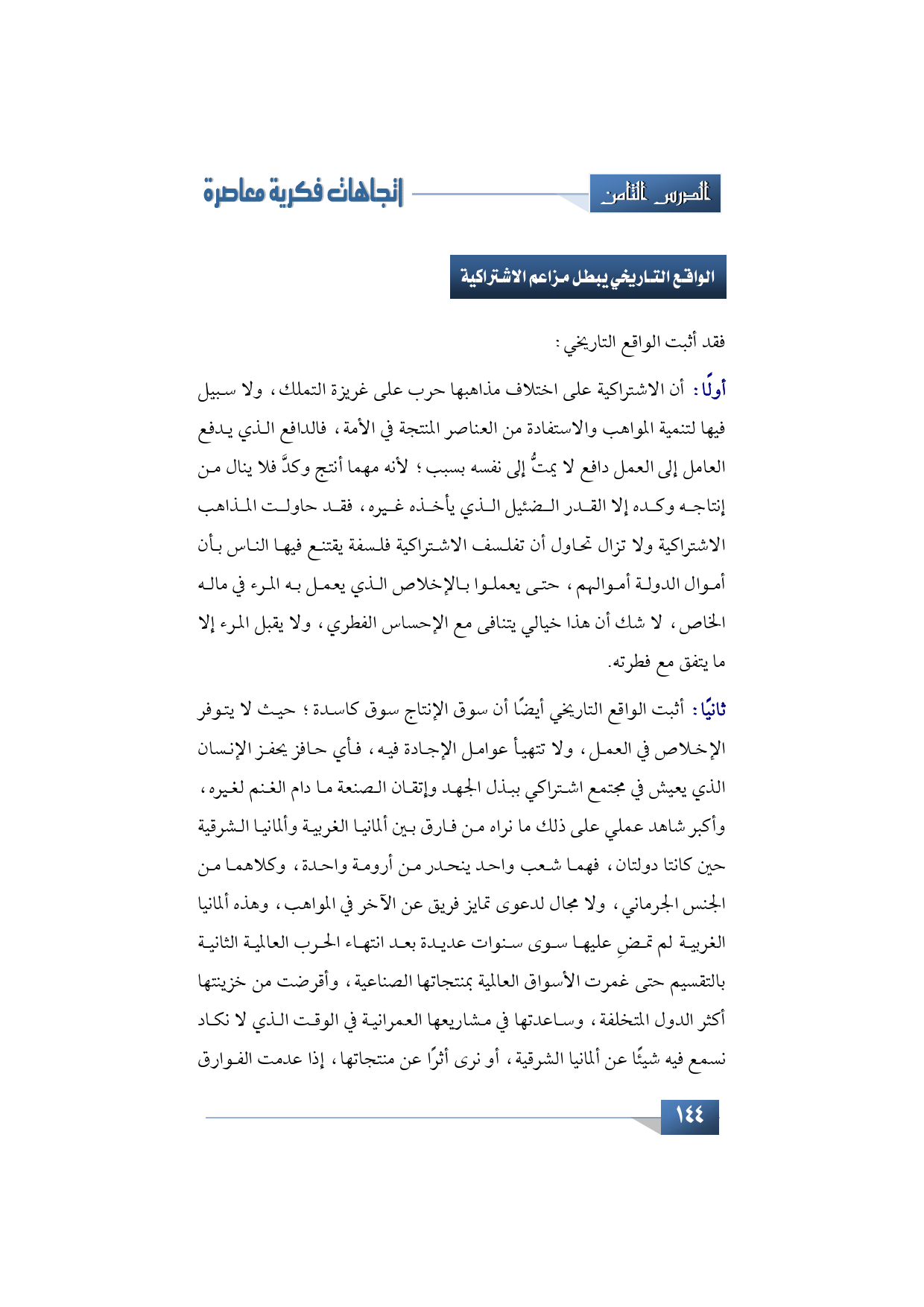 ثانيًّا: أثبت الواقع التاريخي أيضًا أن سوق الإنتاج التاريخي سوق كاسبه، حيث لا يتوفر الإخلاص في العمل، ولا تتهيأ عوامل الإجادة فيه، فأي حافز يحفز الإنسان الذي يعيش في مجتمع اشتراكي ببذل الجهد وإتقان الصنعة ما دام الغنم لغيره، وأكبر شاهد عملي على ذلك ما نراه من فارق بين ألمانيا الغربية وألمانيا الشرقية حين كانتا دولتان، فهما شعب واحد ينحدر من أرومة واحدة، وكلاهما من الجنس الجرماني، ولا مجال لدعوى تمايز فريق عن الآخر في المواهب، وهذه ألمانيا الغربية لم تمضِ عليها سوى سنوات عديدة بعد انتهاء الحرب العالمية الثانية بالتقسيم حتى غمرت الأسواق العالمية بمنتجاتها الصناعية، وأقرضت من خزينتها أكثر الدول المتخلفة، وساعدتها في مشاريعها العمرانية في الوقت الذي لا نكاد نسمع فيه شيئًا عن ألمانيا الشرقية، أو نرى أثرًا عن منتجاتها، إذا عدمت الفوارق