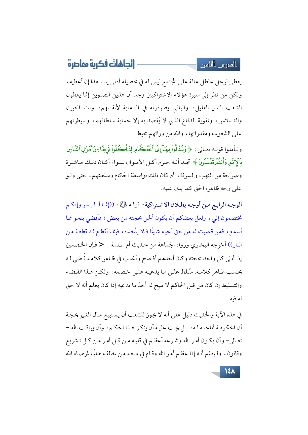 الوجه الرابع من أوجه بطلان الاشتراكية: قوله -صلى الله عليه وسلم-: ((إنما أنا بشر وإنكم تختصمون إلي، ولعل بعضكم أن يكون ألحن بحجته من بعض؛ فأقضي بنحو مما أسمع، فمن قضيت له من حق أخيه شيئًا فلا يأخذه، فإنما أقطع له قطعة من النار)) أخرجه البخاري ورواه الجماعة من حديث أم سلمة -رضي الله عنها، فإن الخصمين إذا أدلى كل واحد بحجته وكان أحدهم أفصح وأغلب في ظاهر كلامه قُضي له بحسب ظاهر كلامه. سُلط على ما يدعيه على خصمه، ولكن هذا القضاء والتسليط إن كان من قبل الحاكم لا يبيح له أخذ ما يدعيه إذا كان يعلم أنه لا حق له فيه.