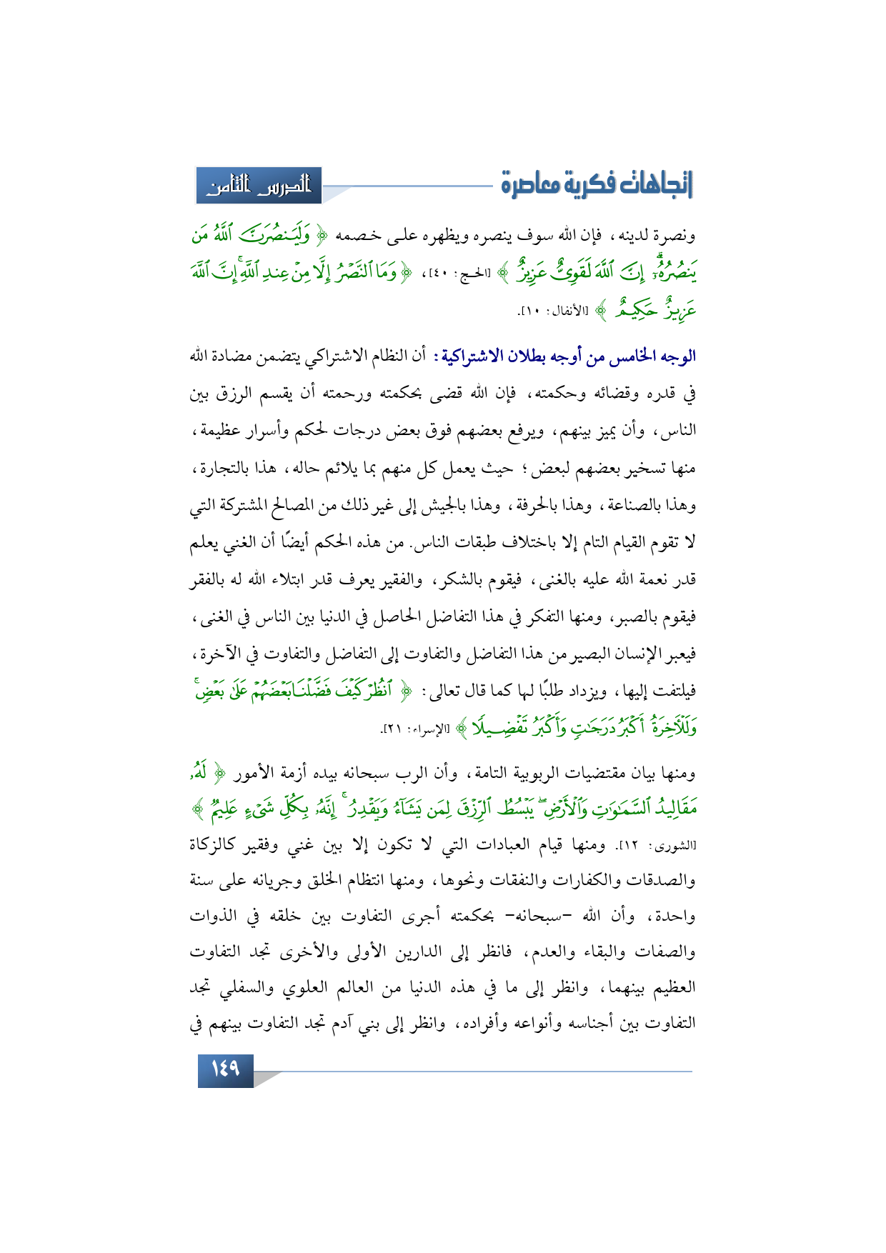 الوجه الخامس من أوجه بطلان الاشتراكية: أن النظام الاشتراكي يتضمن مضادة الله في قدره وقضائه وحكمته، فإن الله قضى بحكمته ورحمته أن يقسم الرزق بين الناس، وأن يميز بينهم، ويرفع بعضهم فوق بعض درجات لحكم وأسرار عظيمة، منها تسخير بعضهم لبعض؛ حيث يعمل كل منهم بما يلائم حاله، هذا بالتجارة، وهذا بالصناعة، وهذا بالحرفة، وهذا بالجيش إلى غير ذلك من المصالح المشتركة التي لا تقوم القيام التام إلا باختلاف طبقات الناس. من هذه الحكم أيضًا أن الغني يعلم قدر نعمة الله عليه بالغنى، فيقوم بالشكر، والفقير يعرف قدر ابتلاء الله له بالفقر فيقوم بالصبر، ومنها التفكر في هذا التفاضل الحاصل في الدنيا بين الناس في الغنى، فيعبر الإنسان البصير من هذا التفاضل والتفاوت إلى التفاضل والتفاوت في الآخرة، فيلتفت إليها، ويزداد طلبًا لها كما قال تعالى: {انْظُرْ كَيْفَ فَضَّلْنَا بَعْضَهُمْ عَلَى بَعْضٍ وَلَلْآخِرَةُ أَكْبَرُ دَرَجَاتٍ وَأَكْبَرُ تَفْضِيلًا} (الإسراء: 21).