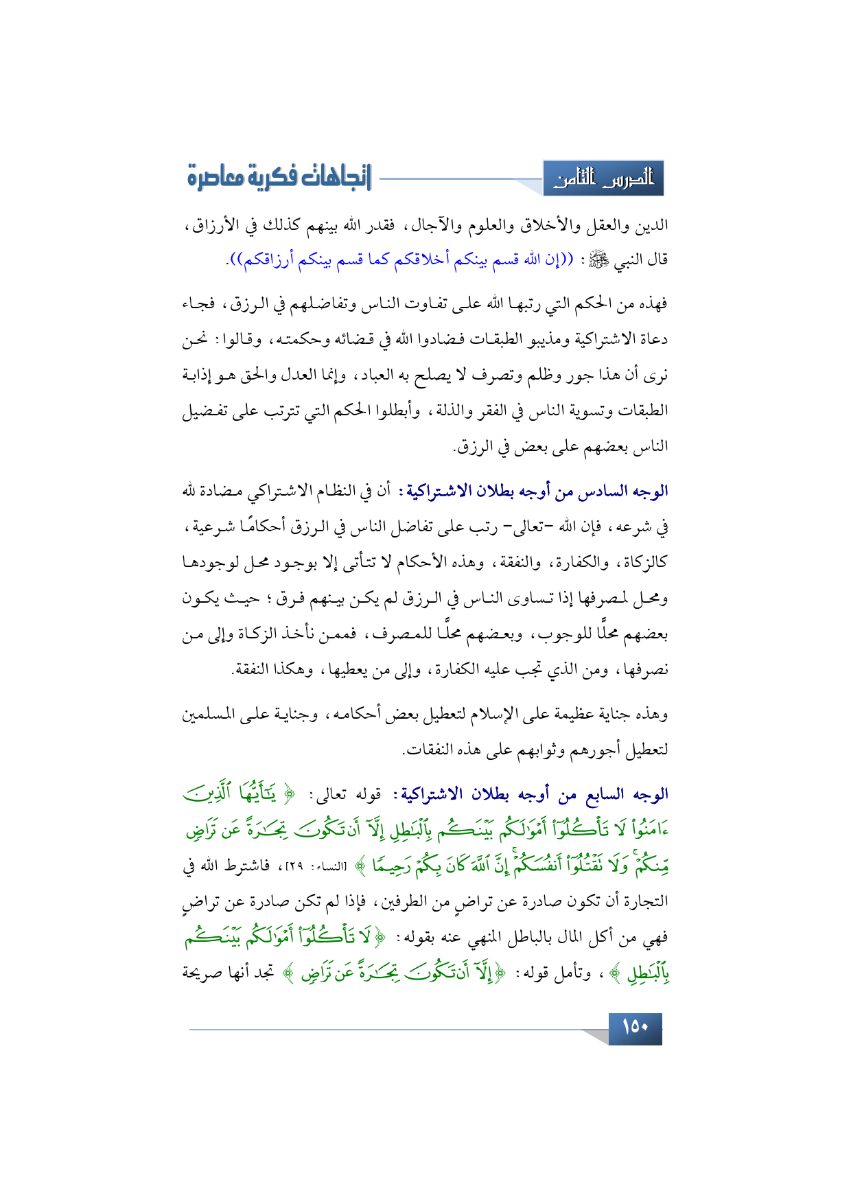 الوجه السابع من أوجه بطلان الاشتراكية: قوله تعالى: {يَا أَيُّهَا الَّذِينَ آمَنُوا لَا تَأْكُلُوا أَمْوَالَكُمْ بَيْنَكُمْ بِالْبَاطِلِ إِلَّا أَنْ تَكُونَ تِجَارَةً عَنْ تَرَاضٍ مِنْكُمْ وَلَا تَقْتُلُوا أَنْفُسَكُمْ إِنَّ اللَّهَ كَانَ بِكُمْ رَحِيمًا} (النساء: 29)، فاشترط الله في التجارة أن تكون صادرة عن تراضٍ من الطرفين، فإذا لم تكن صادرة عن تراضٍ فهي من أكل المال بالباطل المنهي عنه بقوله: {لَا تَأْكُلُوا أَمْوَالَكُمْ بَيْنَكُمْ بِالْبَاطِلِ}، وتأمل قوله: {إِلَّا أَنْ تَكُونَ تِجَارَةً عَنْ تَرَاضٍ} تجد أنها صريحة